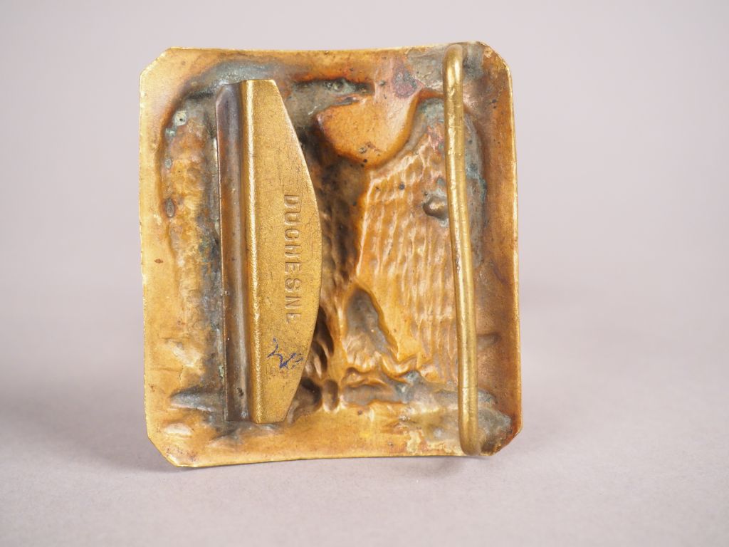 Plaque de ceinturon de la Garde Nationale (aigle tête à droite non couronnée sur foudres), modèle 1852. Plaque emboutie en laiton rectangulaire à pans coupés, crochet signé « DUCHESNE » (70mm X 67 mm). Etat 1