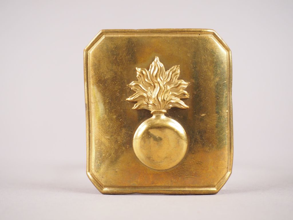 Plaque de ceinturon rectangulaire bombée à pans coupés en laiton doré embouti pour sous-officier d’infanterie. Mod 1852. Grenade flammée embossée dans la plaque, crochet marqué « H . LASSER PARIS », sous plaque en maroquin rouge (60mmx65mm). Etat 1