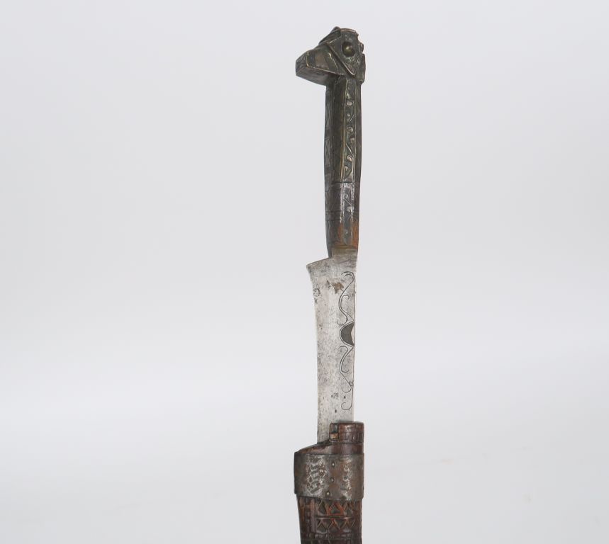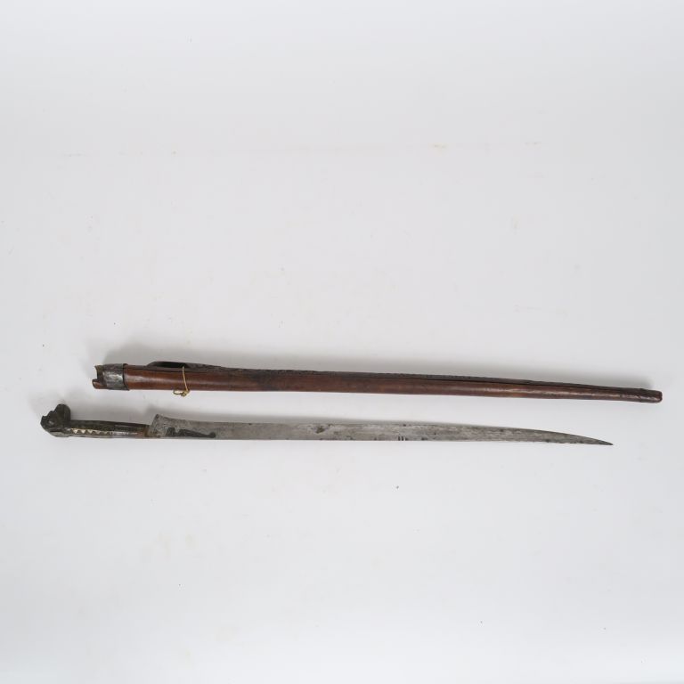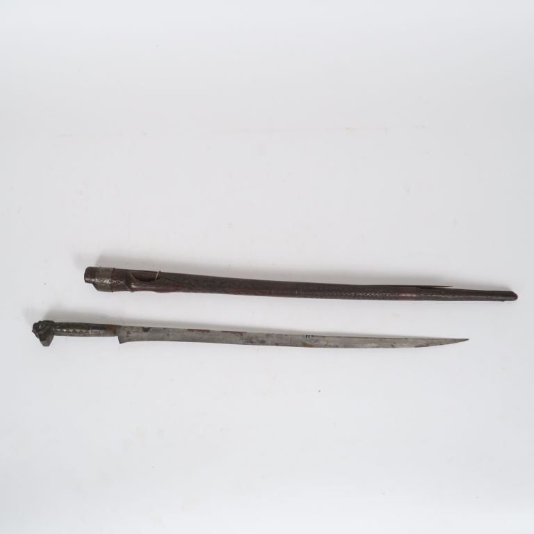 Poignard algérien Flissah. Poignée en laiton gravé en tête de chien, virole en fer. Longue et fine lame à dos. Longueur : 61,5 cm. Fourreau en bois sculpté (ouvert sur la tranche). A.B.E.