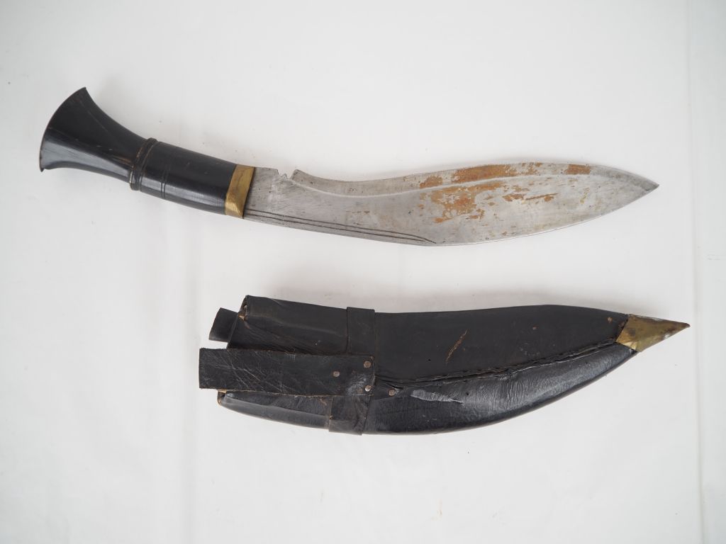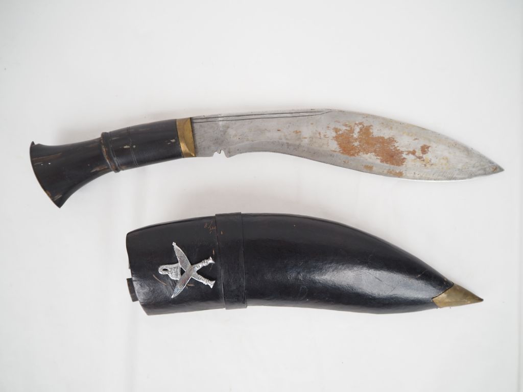 Poignard Koukriss népalais. Poignée en corne. Lame courbe. Fourreau recouvert de cuir avec deux batardeaux, avec motif aux armes du Népal en métal blanc. B.E. XXe siècle.