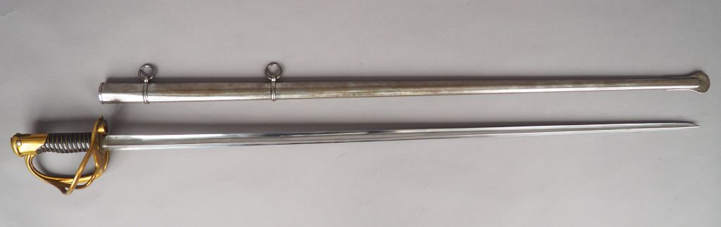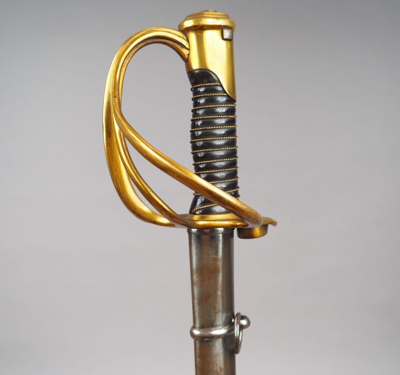 Rarissime sabre-Lance Arcelin pour le mousqueton 1856. Belle lame à trois pans creux droite de 990 mm signée dans le pan creux principal « Couleaux Frères à Klingenthal » (Certains auteurs signalent les sabre-lance dont la lame est signée Coulaux comme des fabrications postérieures). Monture en bronze doré calotte spécifique à courte queue dans laquelle est usinée la mortaise destinée à accueillir la directrice de baïonnette. Poussoir de verrouillage à ressort. Branche de garde principale se dédoublant en deux branches secondaires joignant le plateau de garde. Douille de passage du canon rapportée dans le plateau de garde, usinage en « U » sur la lèvre de ce dernier pour faciliter la prise de visée. Fusée en corne noire à simple filigrane de fils de laiton. Dans son fourreau en tôle d’acier poli à deux bracelets. Etat 1