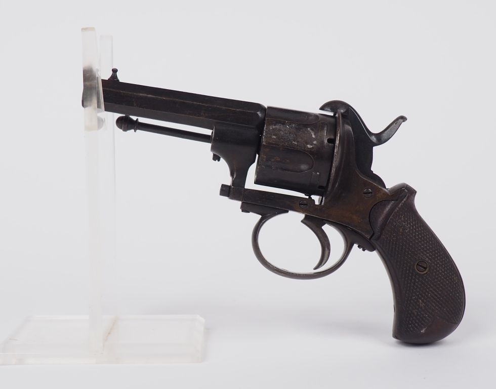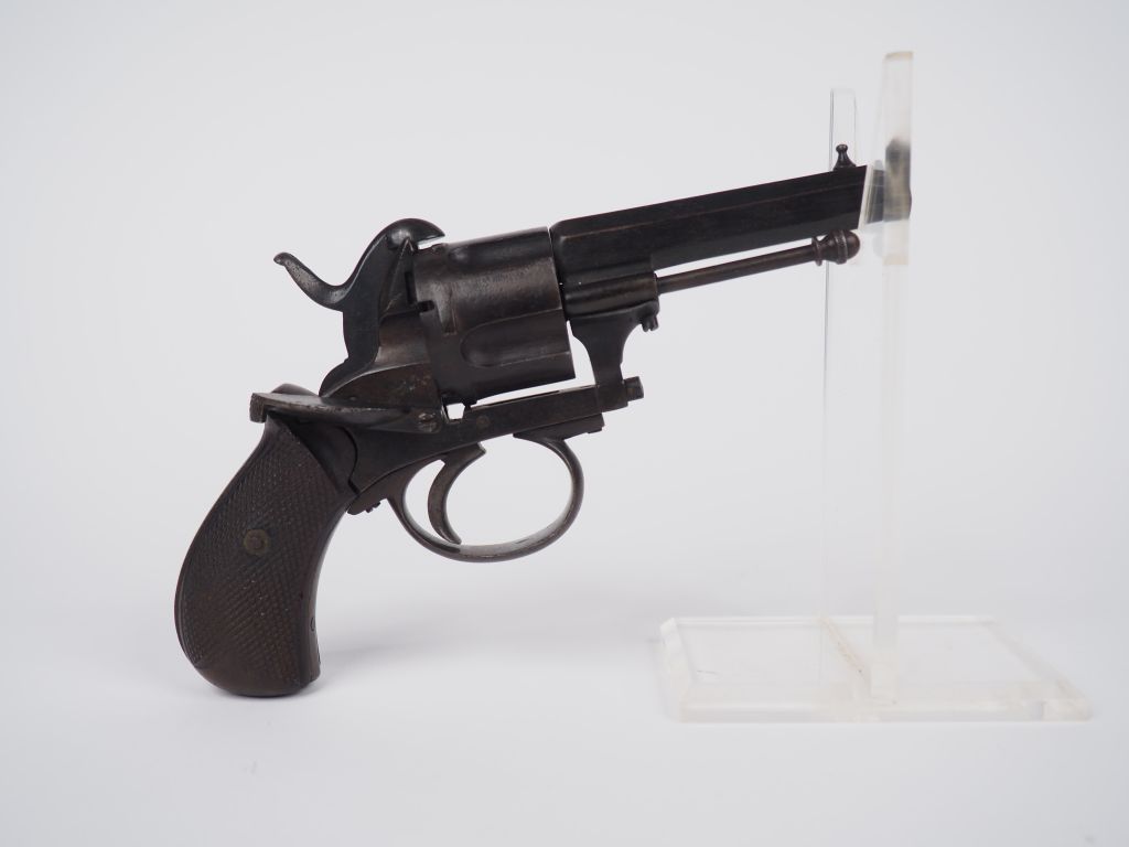 Revolver à broche, cinq coups, calibre 9 mm. Canon à pans. Plaquettes de crosse en noyer quadrillé. Finition bronzée patinée. Longueur : 20 cm. A.B.E. (Retour de détente à revoir). Vers 1870