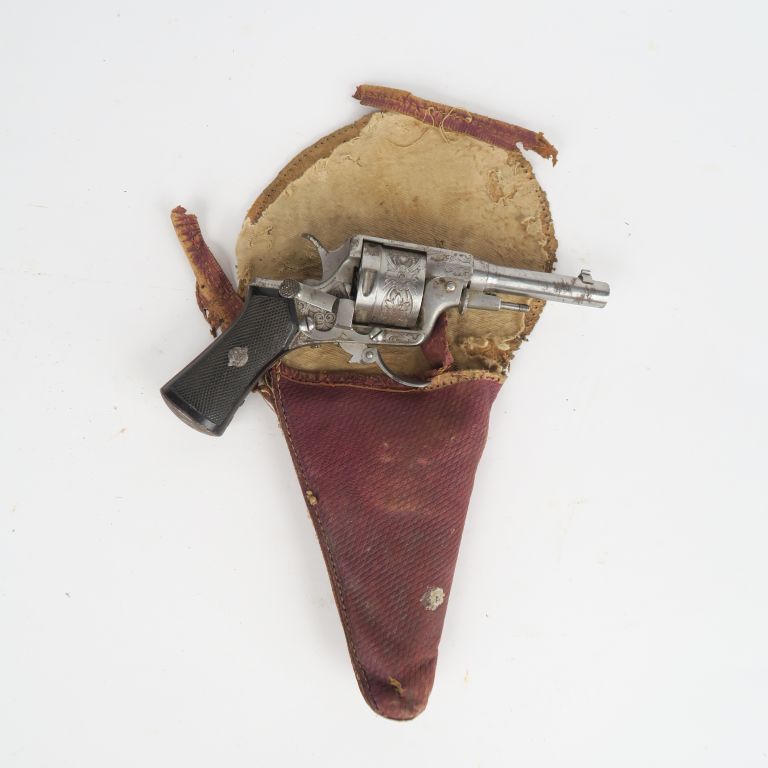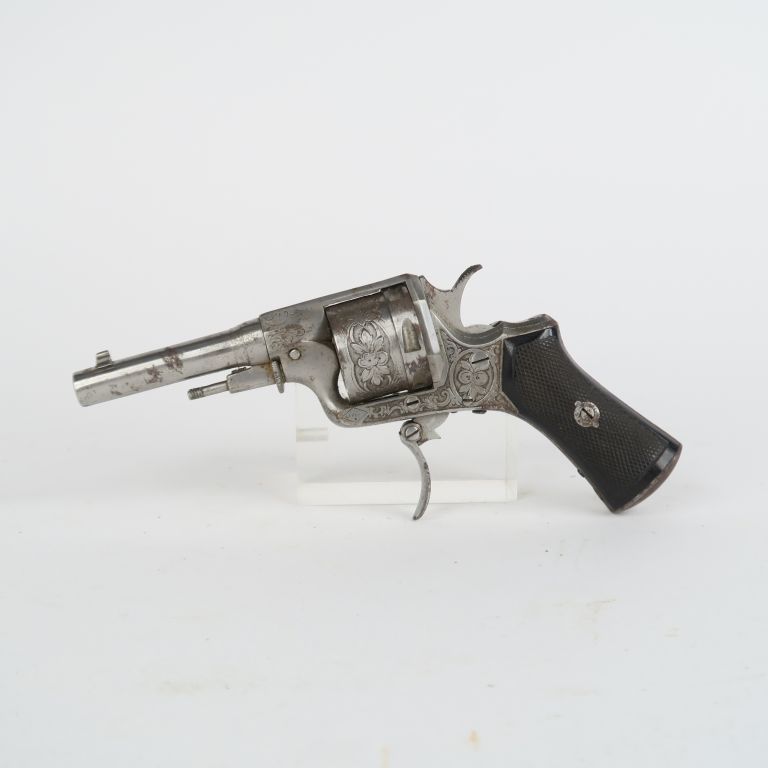 Revolver Baby Perrin, six coups, calibre 9 mm. Carcasse gravée de rinceaux feuillagés poinçonné dans un losange « Ls PERIN ». Détente pliante. Manque la tête de baguette. Plaquettes en bois noirci quadrillé. A.B.E. Belles rayures 16 cm. Dans un étui en cuir.