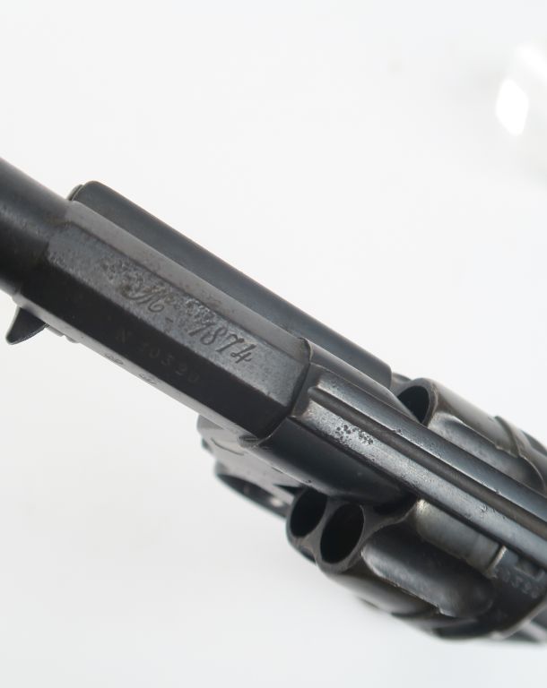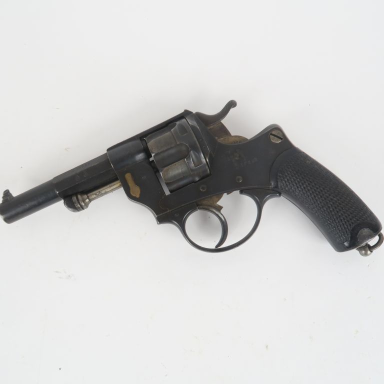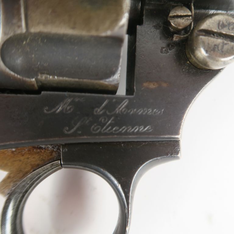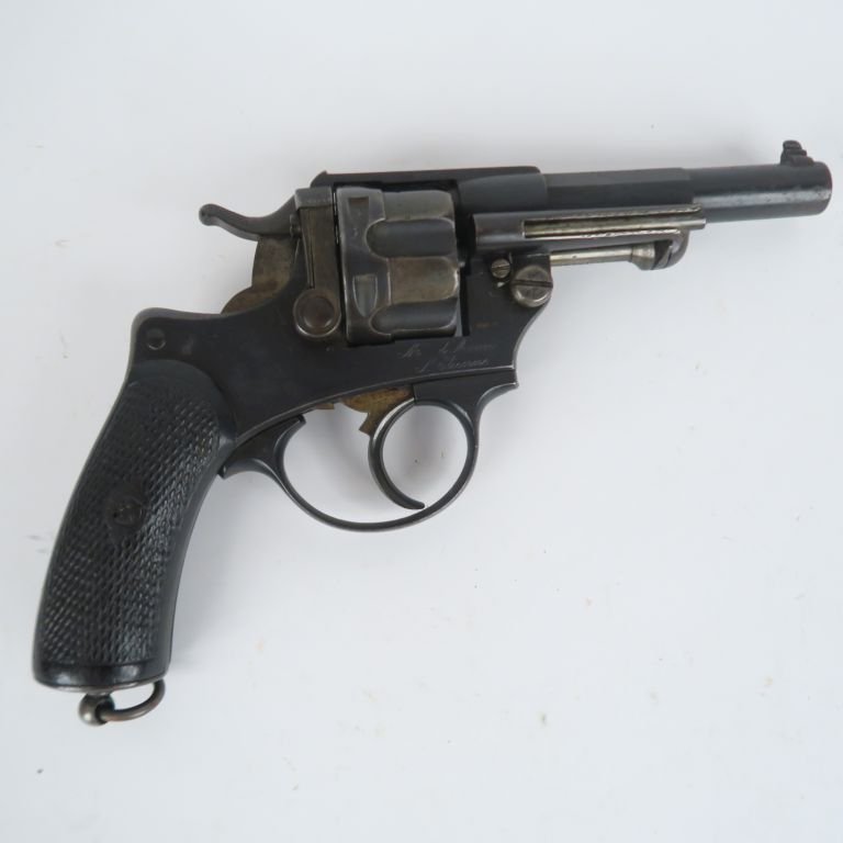 Revolver d’officier modèle 1874 S-1876, six coups, calibre 11/73 mm Carcasse gravée « Mre d’armes St Etienne ». Plaquettes de crosse en bois noirci quadrillé. A.B.E. (piqures, remis en couleurs). Toutes pièces au même matricule N10320. Longueur : 23 cm. Rayures présentes.