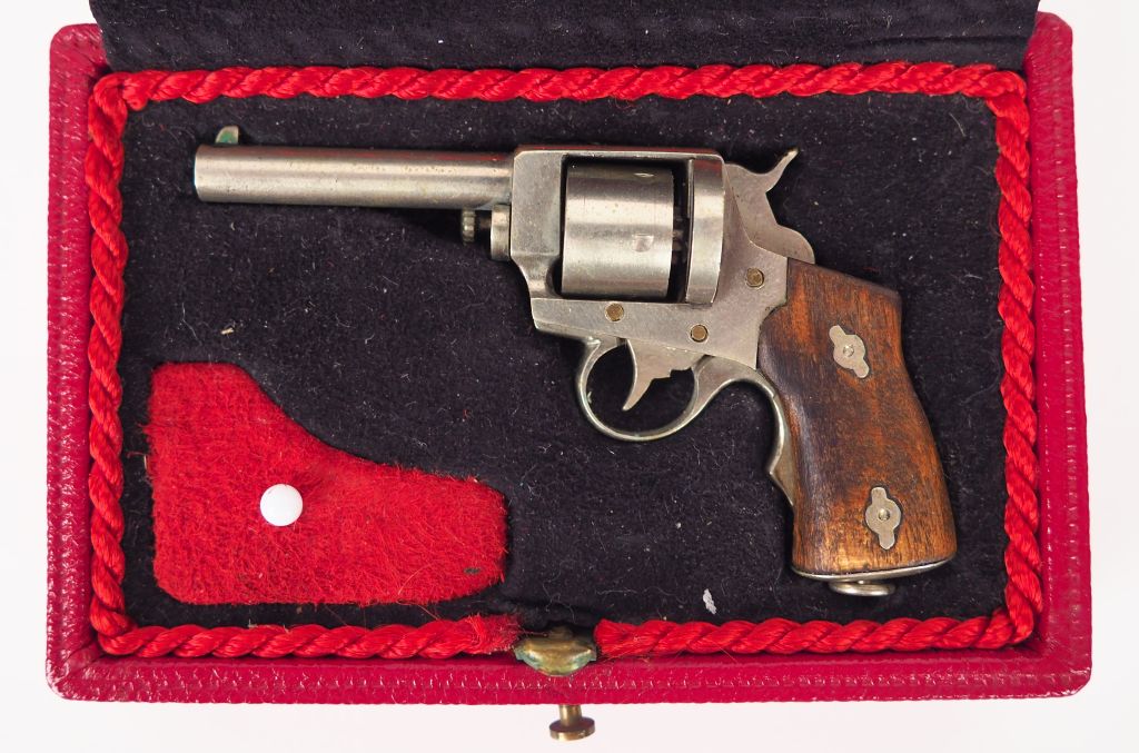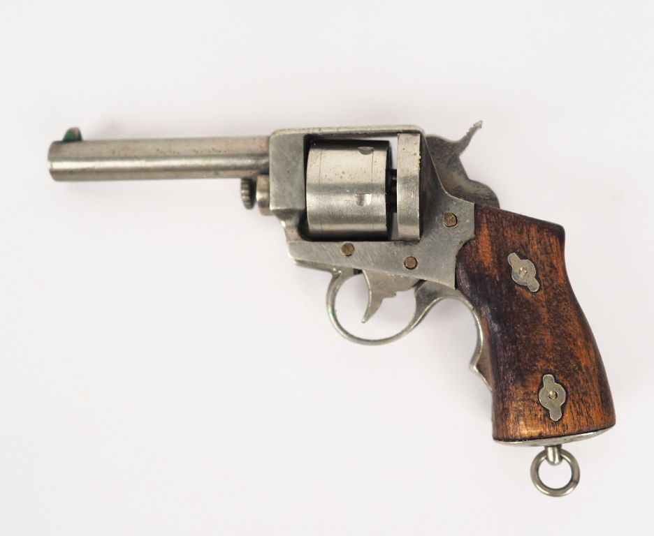 Revolver Lefaucheux de marine modèle 1870 miniature Plaquettes de crosse en noyer. B.E. Mécanique fonctionnelle. Dans son écrin gainé de suédine verte. Longueur arme : 6 cm. Coffret : 8,5 x 5,5 cm. B.E.
