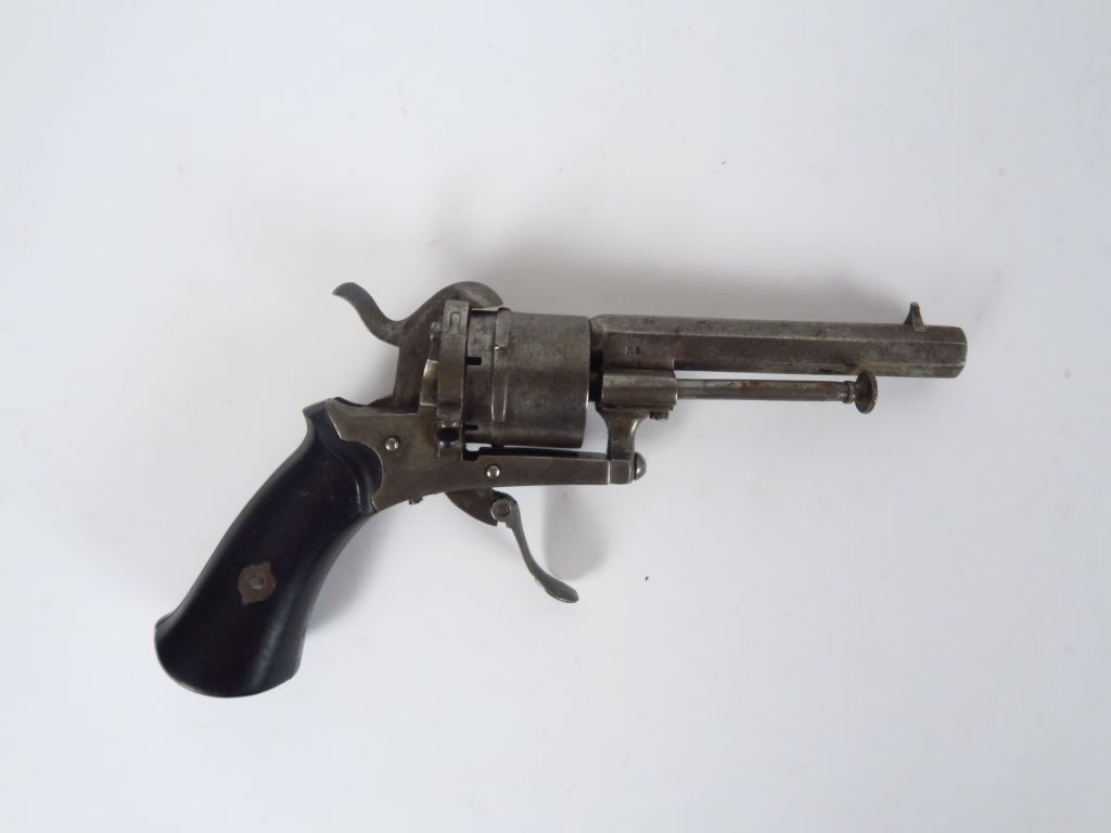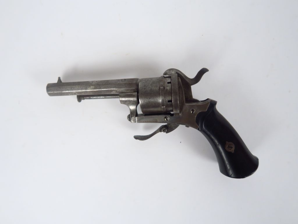 Revolver système Lefaucheux calibre 7mm à broche, monture en ébène, ensemble poli blanc. Réception du banc d'épreuve de Liège (ELG), détente repliable, canon octogonal, mécanisme fonctionnel. (1). Arme de catégorie D.