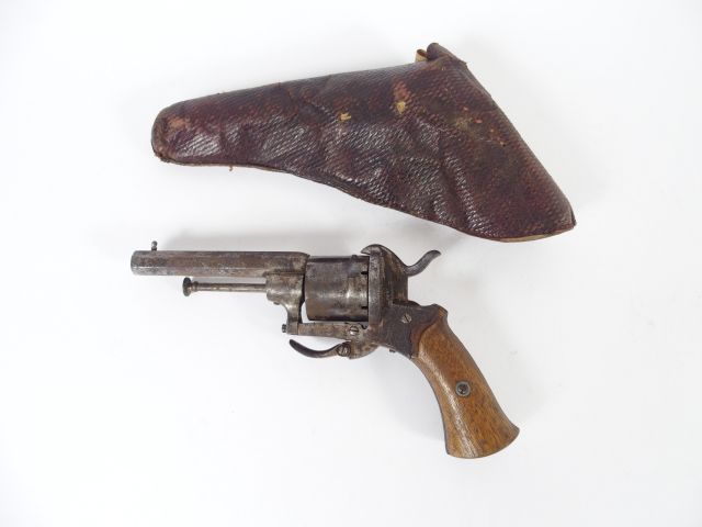 Révolver système Lefaucheux calibre 7mm à broche poli blanc, mécanisme fonctionnel, détente escamotable, canon octogonal, plaquettes de crosse en noyer blond. Dans un étui en cuir fauve quadrillé. 1-