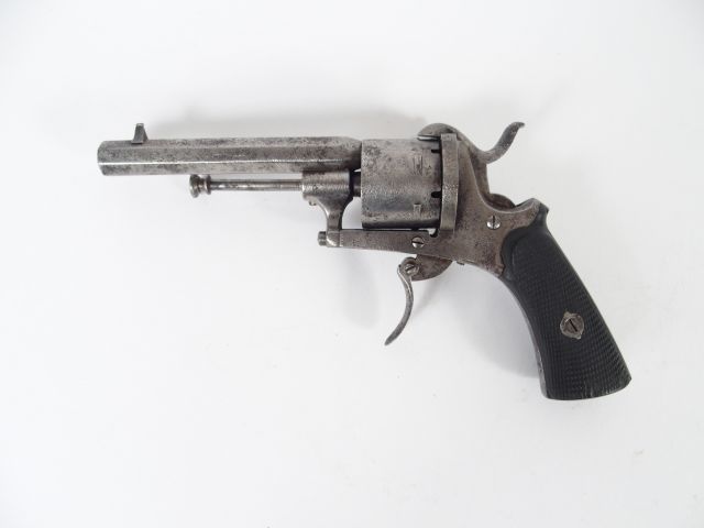 Révolver système Lefaucheux fabrication Belge calibre 7mm à broche poli blanc (légère peau d’orange), mécanisme fonctionnel, détente escamotable, canon octogonal, plaquettes de crosse en noyer sombre quadrillées.1-