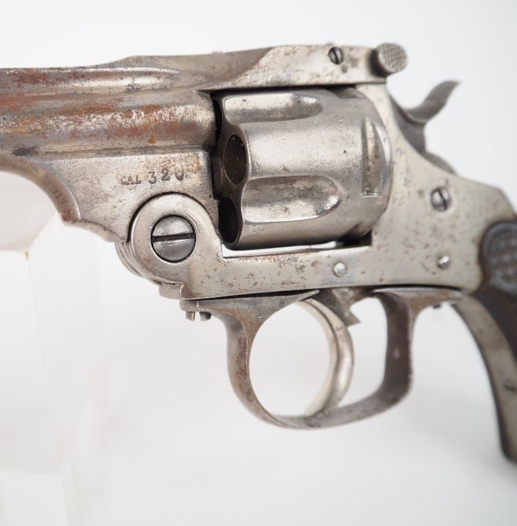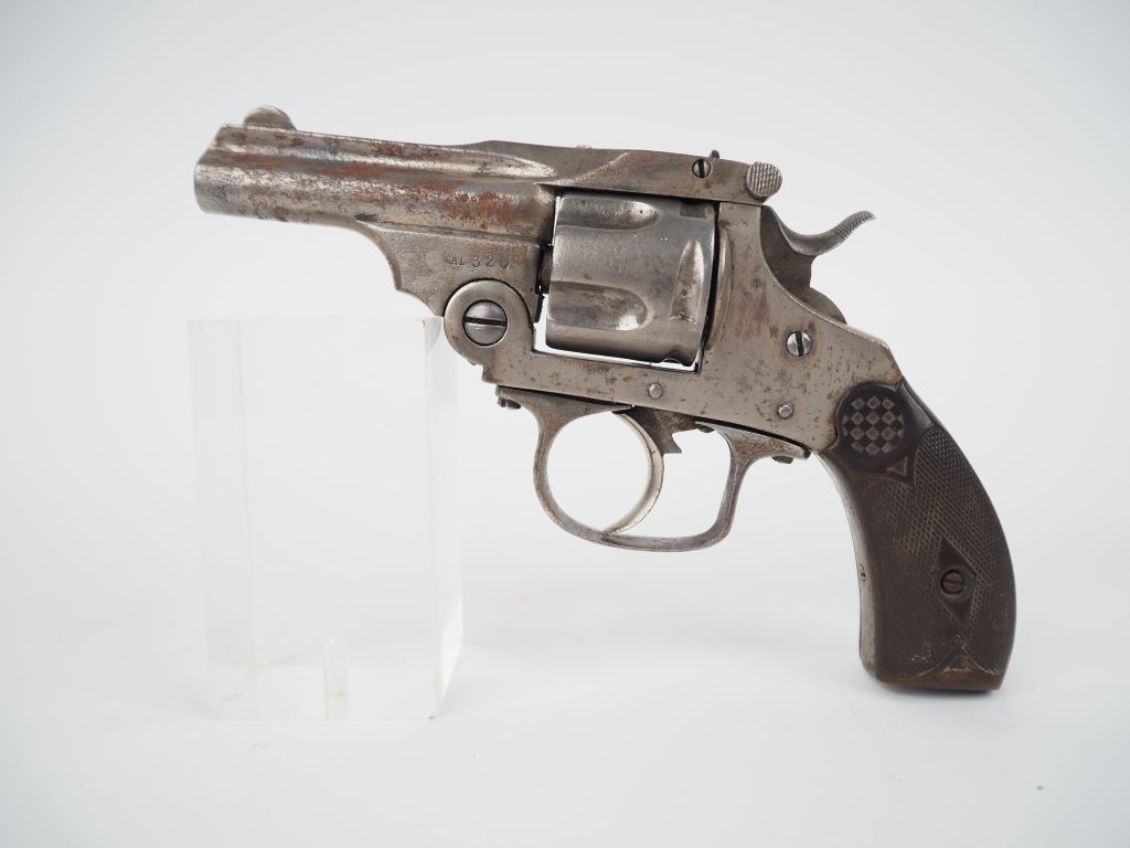 Revolver type Smith Wesson Top Break, cinq coups, calibre 320, DA. Canon avec bande Plaquettes de crosse en bakélite. A.B.E. Fabrication liégeoise. Vers 1880.