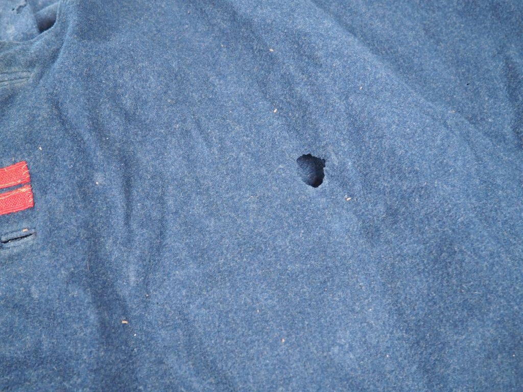 Rotonde de manteau. En drap gris de fer bleuté, fermant par quatre boutons à deux galons cul de dé écarlate. E.M. (Trous).