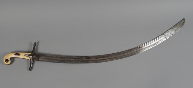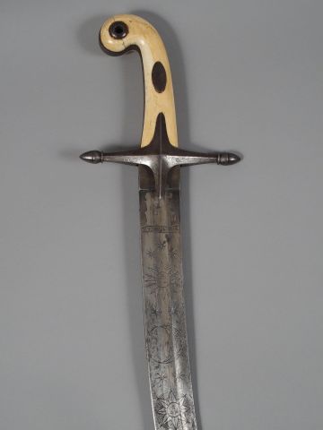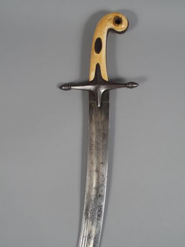 Sabre à l’orientale de fabrication « M. C Eisenhauer » seconde moitié du XIXème siècle. Poignée en crosse montée à plate semelle avec des plaquettes en ivoire. Monture acier poli, croisière de garde symétrique à terminaison en gland dans leur cupule. Médaillon central ovale, fort œillet de passage de dragonne percé à jour au niveau du pommeau (manque une garniture). Superbe lame bien courbe genre tranche lard (40mm à sa base) longueur 790mm. Triple gorge, décor de motifs astrologiques gravés au trait (croissant de lune, étoiles, soleil rayonnant) La présence de traces de nickelage sur la lame indiquant une fabrication très tardive. Pas de fourreau. (1-)