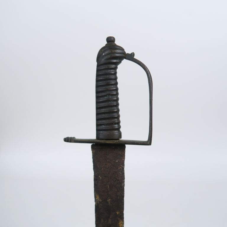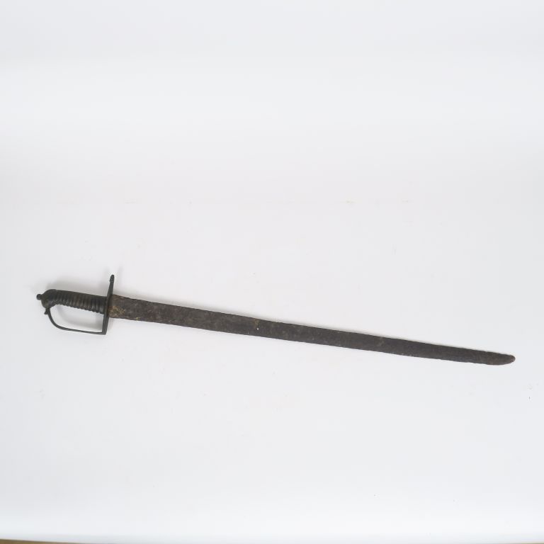 Sabre briquet. Monture en laiton patiné noir, monté avec une lame du XVIIe siècle. Dans l’état. Fortes piqûres. Longueur : 87 cm.