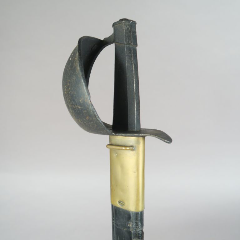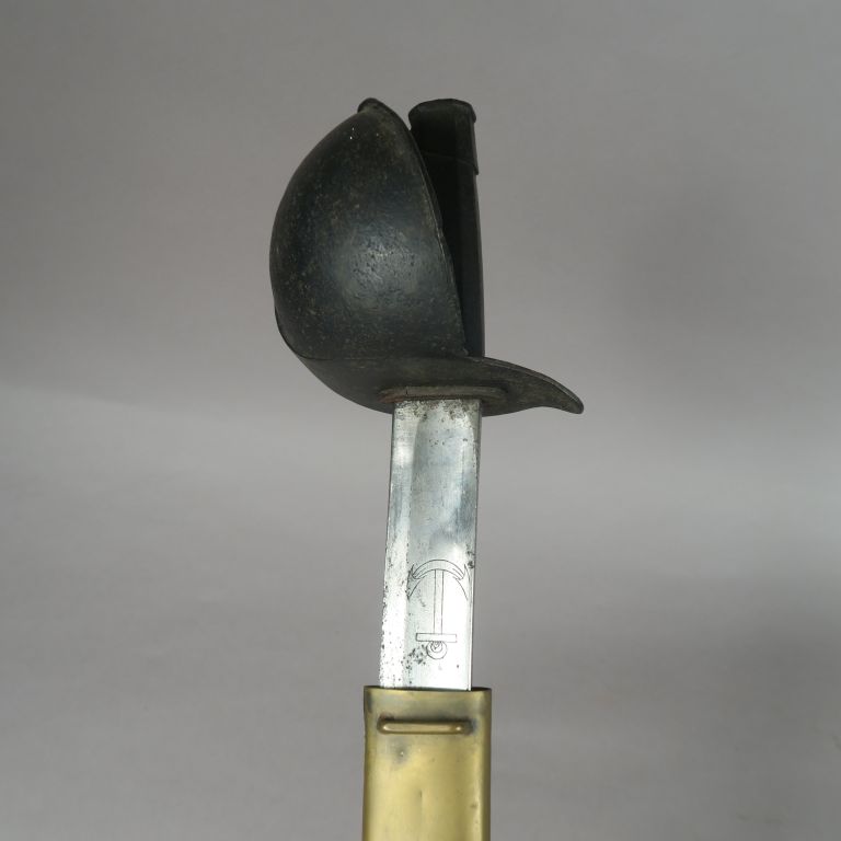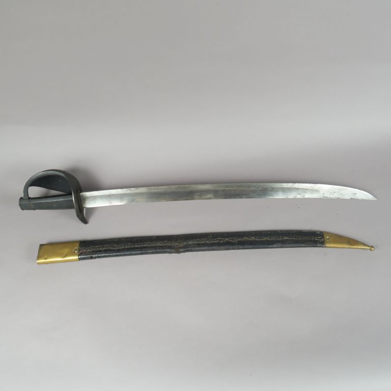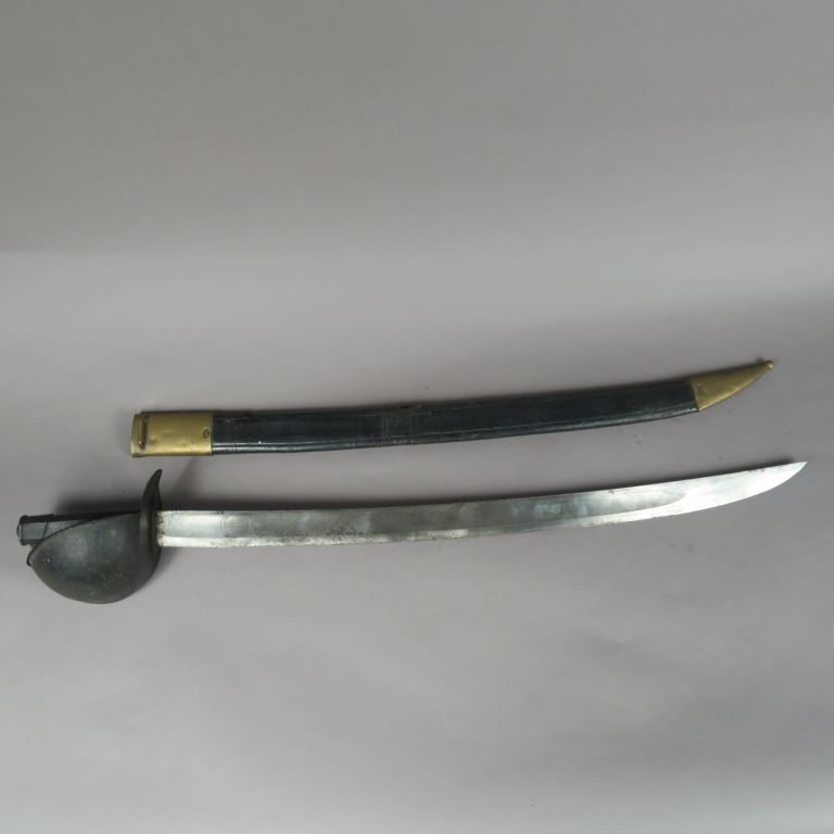 Sabre d’abordage modèle 1833. Poignée à pans et garde à coquille, peint en noir (piqures). Lame courbe à dos plat et pans creux, à dos plat gravé d’ancres à dos plat «Mre Impale de Châtellerault Mai 1860 ». Fourreau en cuir (usures) à deux garnitures en laiton. Longueur : 85 cm. A.B.E.