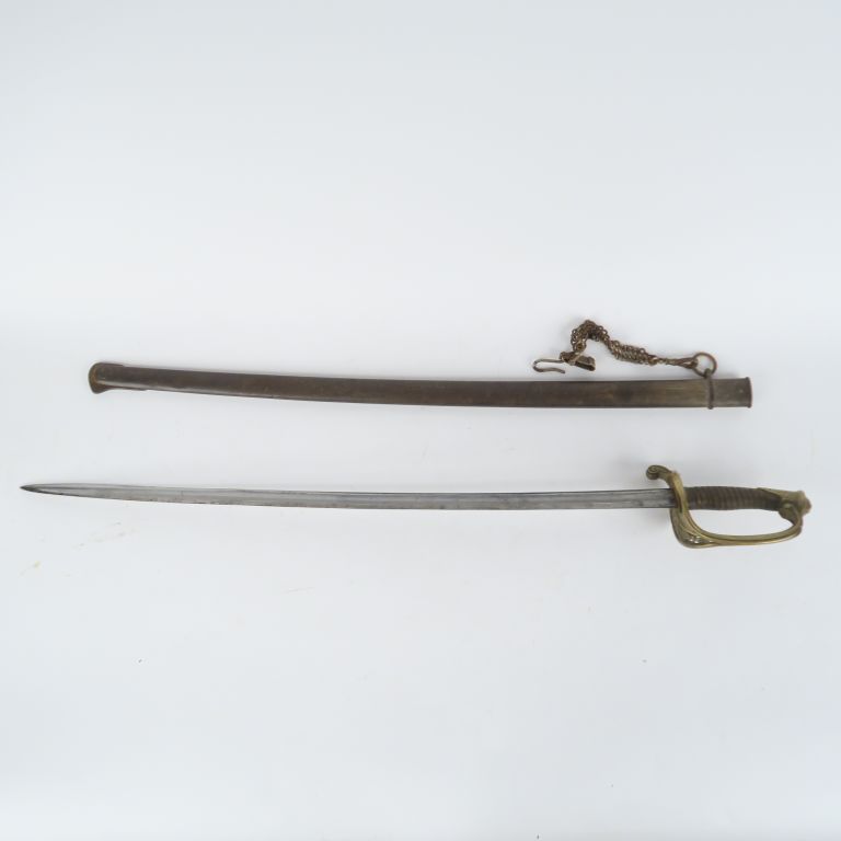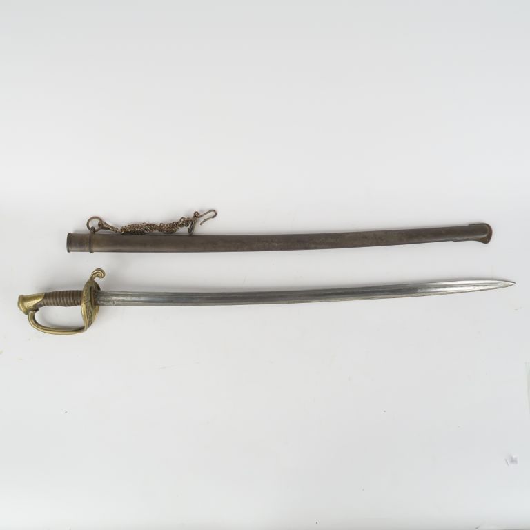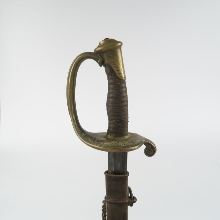 Sabre d’adjudant d’infanterie modèle 1845. Poignée en corne avec filigrane. Monture en laiton, garde à une branche ajourée de rinceaux feuillagés, matriculée sur la contre garde. Lame cintrée réaffutée à dos plat gravé de Châtellerault, daté « 8bre 1878 Adjt d’Infrie Mle 1845 ». Fourreau en tôle de fer (piqures uniformes) avec reste d’un matricule identique sur le 1er bracelet. Avec porte sabre gourmette. Longueur : 94 cm. Fortes usures.
