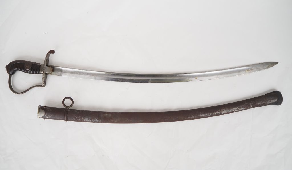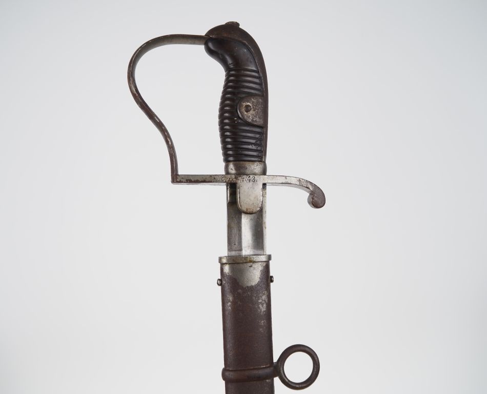 Sabre d’artillerie à pied modèle 1873 prussien. Poignée en caoutchouc durci. Monture en fer, garde à la Blücher, matriculée « 13 AF 4 43 ». Lame à dos plat daté « 14 » poinçonnée au talon probablement de HORSTER à Solingen. Fourreau en tôle de fer à un bracelet et anneau fixe. Longueur : 92 cm. E.M. (Oxydations)