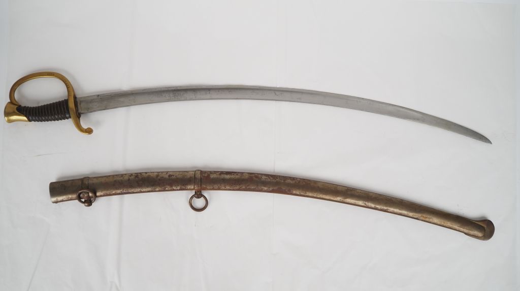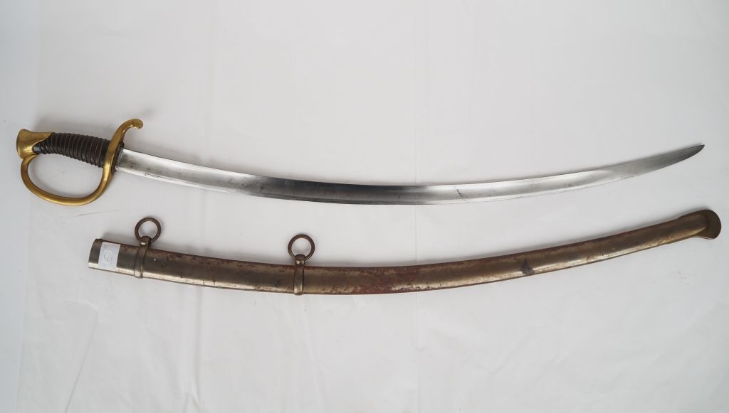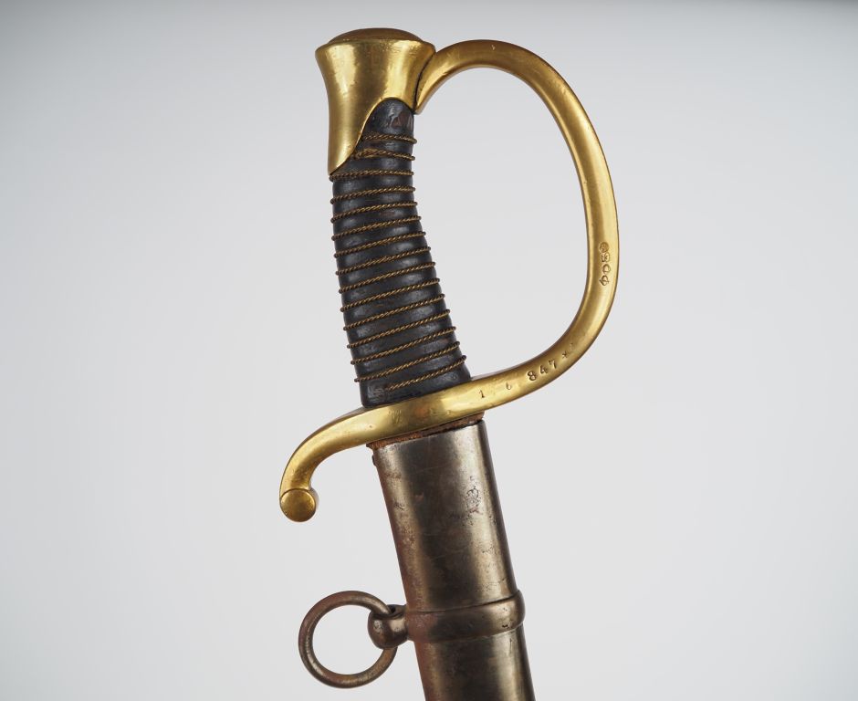Sabre de canonnier monté modèle 1829. Poignée recouverte de cuir avec filigrane en laiton. Monture en laiton, garde à une branche avec nombreux matricules. Lame courbe à dos plat avec restes de gravure « … Juin 1899 » Fourreau en tôle de fer à deux bracelets. Longueur : 98 cm. A.B.E. (oxydations).