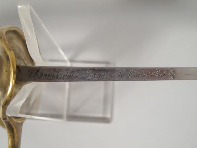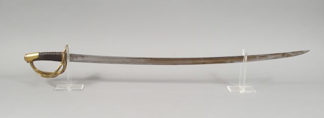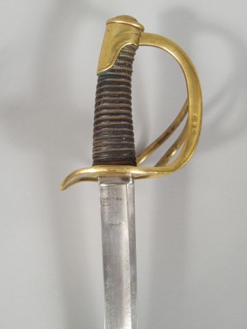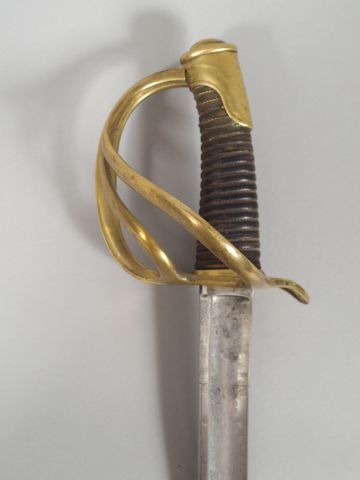 Sabre de cavalerie 1822, modèle allégé, monture en bronze coulé, sans décorations. Fusée en bois gainé de cuir noir, filigrane en parti présent, lame à gorge courbe de 850 mm de long. Reste de gravure aux armes de France sur une face et de canons croisés et trophées d’armes. Signature au dos « Manufacture Royale du Klingenthal ».Pas de fourreau (1-)