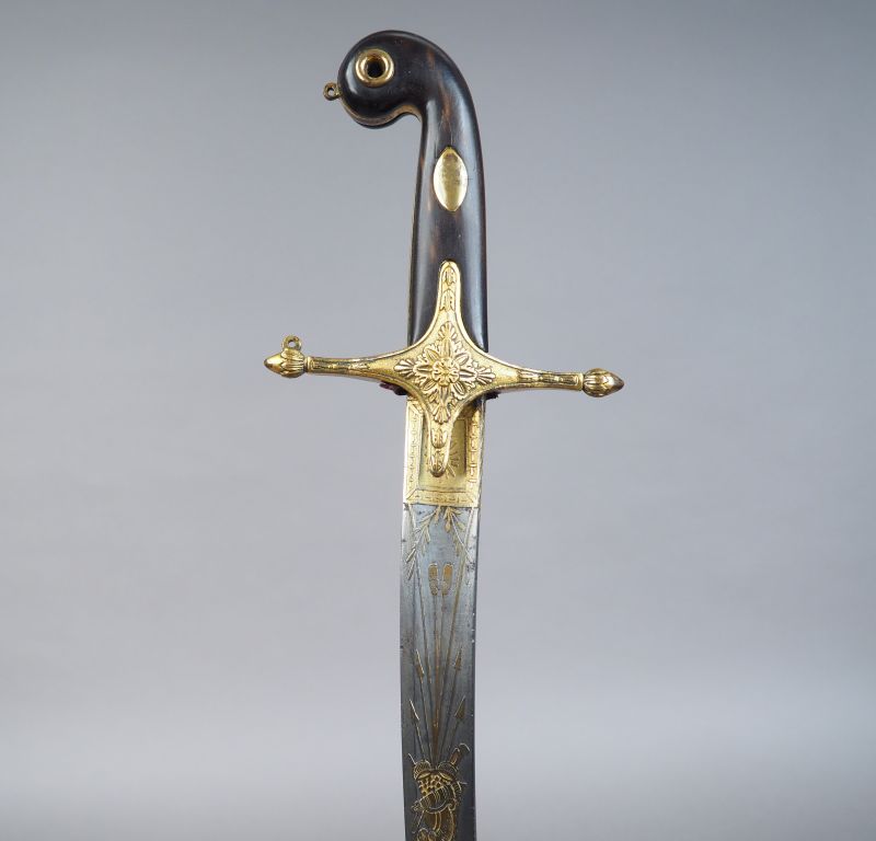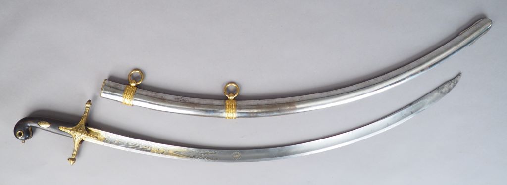Sabre de cavalerie à l’orientale. Belle lame courbe en Damas de 780 mm de long, beau décor en relief, travail à l’acide repris au ciseau à froid et à l’échoppe, ce décor court sur la moitié de la lame et est rehaussé de dorure partiellement absente, dos rond, pointe en langue d’aspic, monture en crosse, œil au niveau du pommeau habillé de laiton, poignée montée à plate semelle en corne noire, garde symétrique en bronze doré, attente de branche de garde en chainette (absente). Fourreau tôle d’acier et bracelets plats. La construction avec une lame en Damas et l’emploi de la gravure à l’acide indique une fabrication contemporaine de la Restauration. Etat 1-