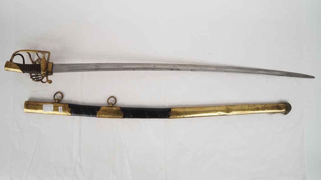 Sabre de cavalerie lourde à garde de bataille. Poignée recouverte de cuir à gros grain. Monture en laiton, garde à coquille ajourée. Lame à dos plat, cintrée, et gouttière. Fourreau en cuir verni à trois garnitures en laiton découpé. A.B.E. Remontage composite en partie d’époque Premier Empire. Longueur : 105 cm.
