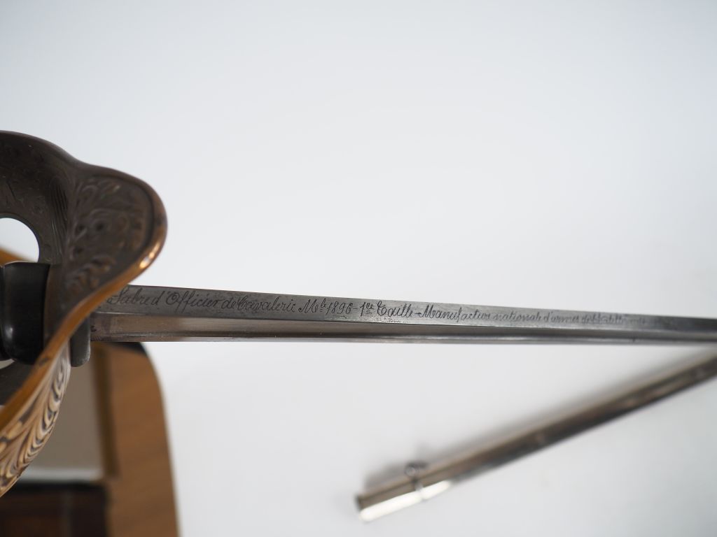 Sabre de cavalerie modèle 1896 pour officier, lame droite dos plat portant un important marquage en cursives « Sabre d’officier de cavalerie modèle 1896 1ere taille Manufacture nationale de Châtellerault 1908 J H » , monture en bronze doré ciselé avec plateau de garde symétrique se prolongeant en branche de garde joignant le pommeau, fusée corne filigranée . Dans son fourreau en tôle d’acier. Etat 1.