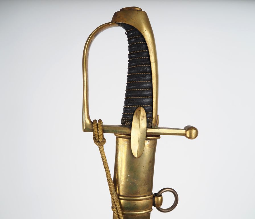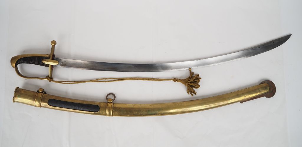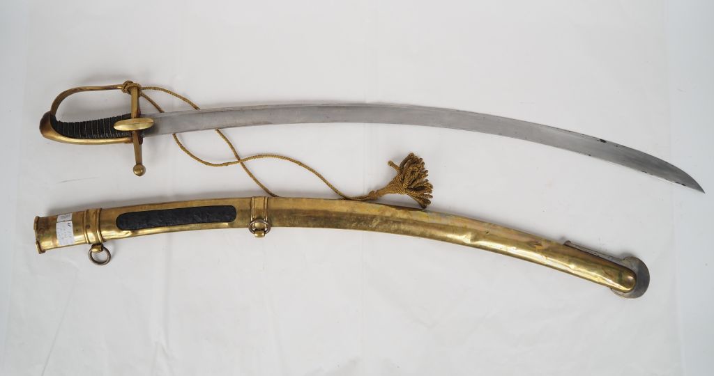 Sabre de chasseur à cheval de la Garde impériale. Poignée recouverte de cuir avec filigrane. Monture en laiton, garde à une branche et oreillons ovoïdes. Porte des marquages de Versailles. Lame courbe à dos plat et pans creux poinçonné, dos gravé « Mfture Imple du Klingenthal Coulaux Frères ». Fourreau en laiton poinçonné à crévées recouvertes de cuir. Dard en fer. Longueur : 105 cm. Avec une dragonne en passementerie dorée. A.B.E. Fabrication du XXe siècle au modèle du Premier Empire.