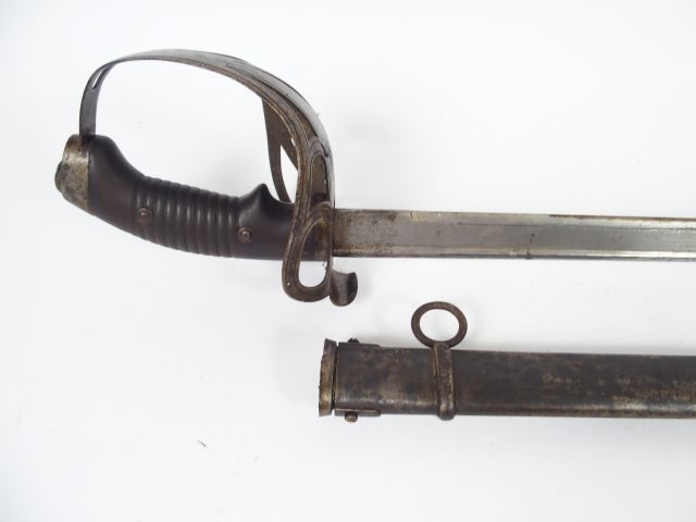 Sabre de Hussard prussien contemporain de la première guerre mondiale, Arme montée fer, branches de garde multiples plates, plateau à l’aigle prussien, fusée en bakélite sombre, Lame plate à jonc dorsal, signature au ricasso “E F Holstein Solingen”, affutage de guerre discret, réception Prussienne de 1891 au dos “W91”. Fourreau tôle d’acier à un bracelet fixe, réception régimentaire au niveau de la chape “7. H. 4. 177.” (Soit 177eme sabre du 4eme escadron du 7éme régiment de hussard (Regiment König Wilhelm I. (1. Rheinisches) Nr. 7) ).1