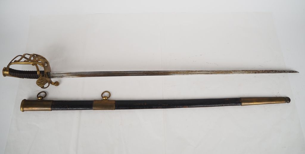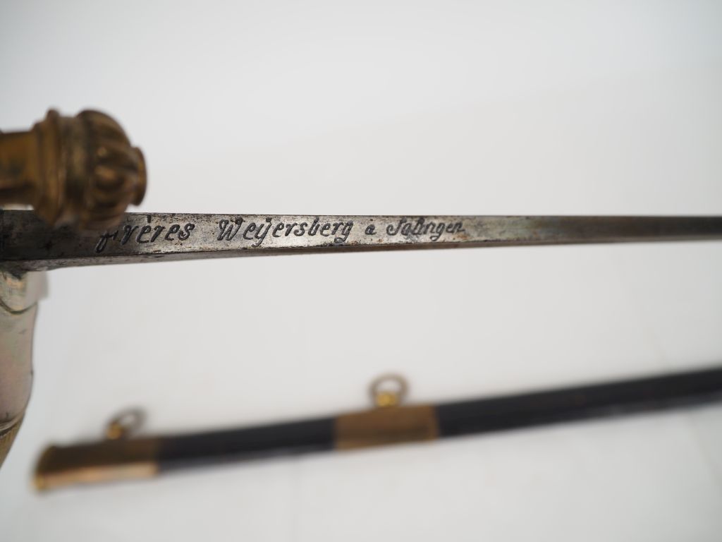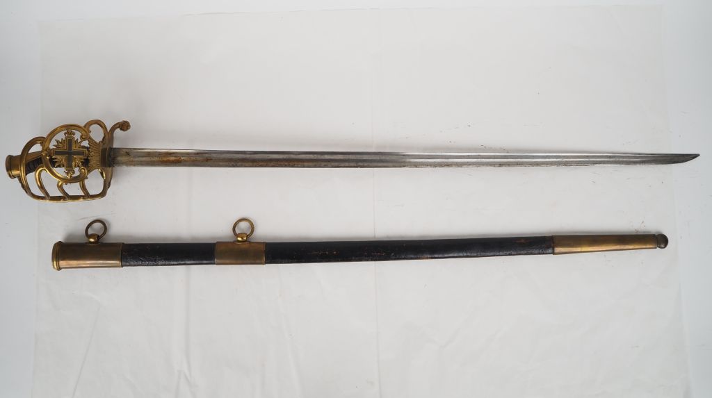 Sabre de mousquetaire « gris » (1ère compagnie) de la Maison militaire du Roi. Poignée recouverte de chagrin. Monture en laiton doré, garde à coquille à la croix des mousquetaires à cœur argenté. Lame à double pans creux, poinçonnée « AP » à dos gravé «Frères Weyersberg à Solingen ». Fourreau en cuir à trois garnitures en laiton. A.B.E. Fabrication postérieure avec lame d’époque. Longueur : 109 cm.