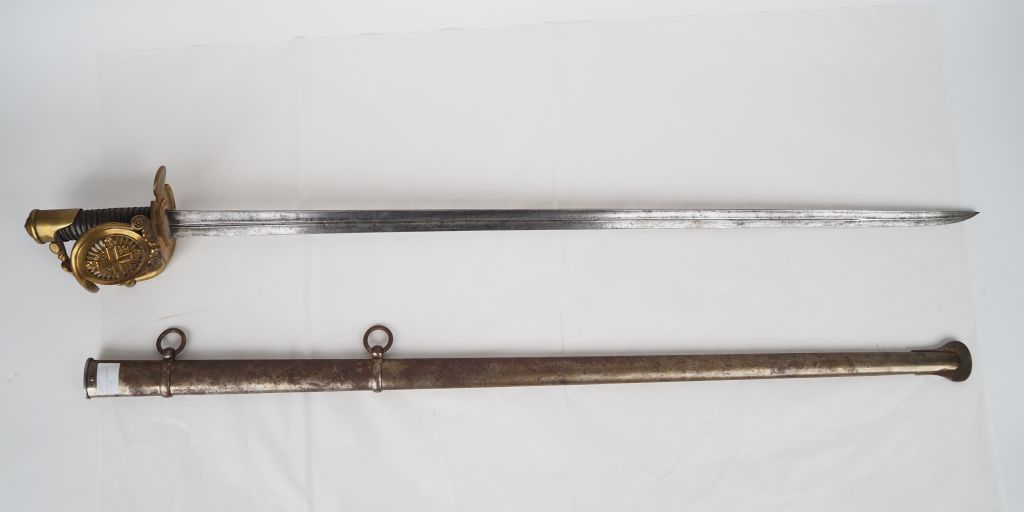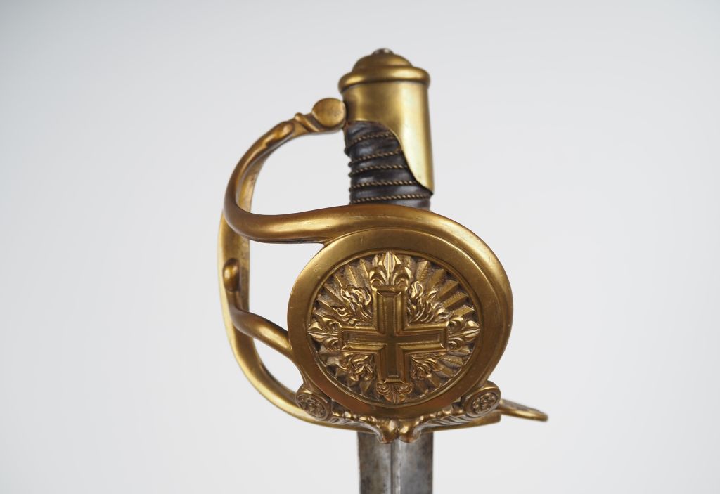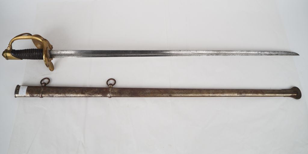 Sabre de mousquetaire « noir » (2e compagnie) de la Maison militaire du Roi. Poignée recouverte de cuir avec filigrane. Monture en laiton, garde à trois branches et coquille à la croix des mousquetaires. Quillon en palmette. Lame à gouttière médiane. Fourreau type cavalerie de ligne 1854 en tôle de fer à deux bracelets et deux anneaux. A.B.E. Fabrication du XXe siècle, de style Restauration. Longueur : 116 cm