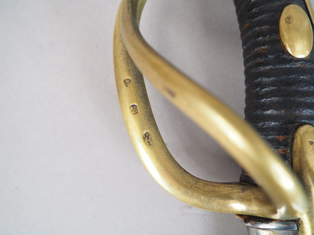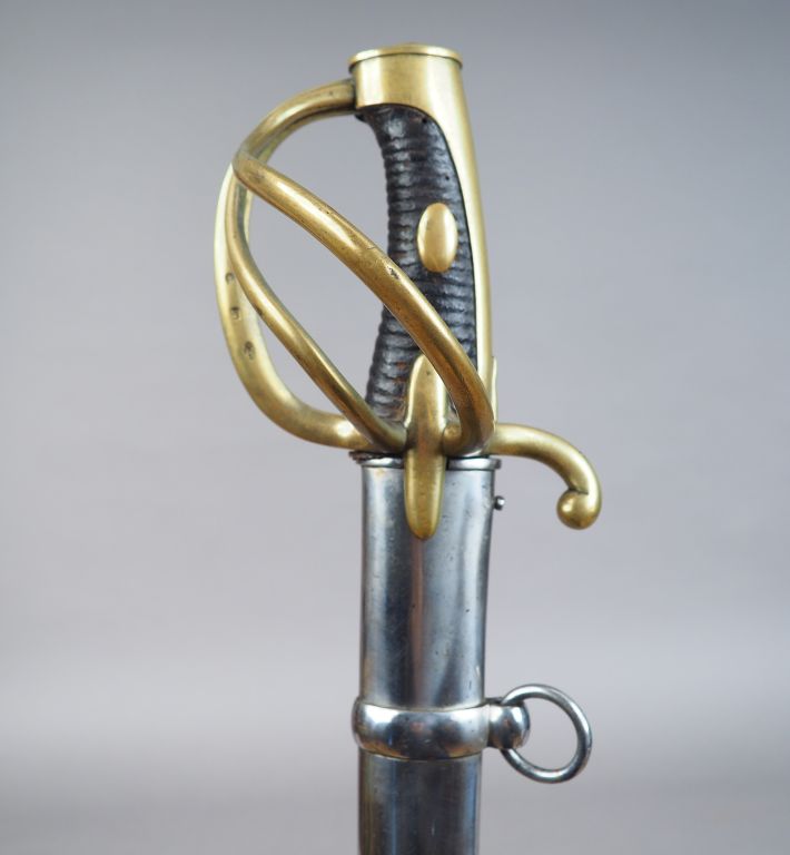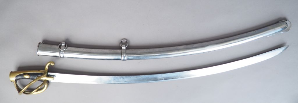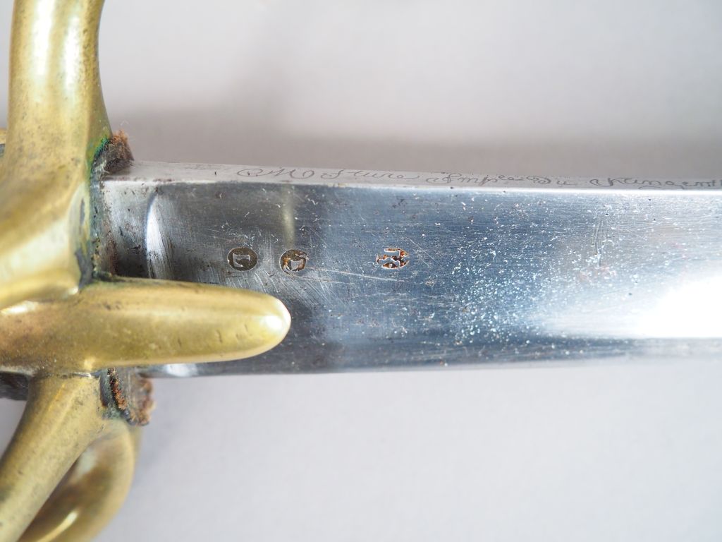 Sabre de troupe de cavalerie légère à la chasseur modèle An IX. Fabrication « Manufacture impériale du Klingenthal août 1813 ». Signature en cursives sur le dos de la lame, lame blanche, monture bronze à branches multiples, fusée bois habillée de chagrin sombre. Dans son fourreau en tôle de fer. Etat 1-