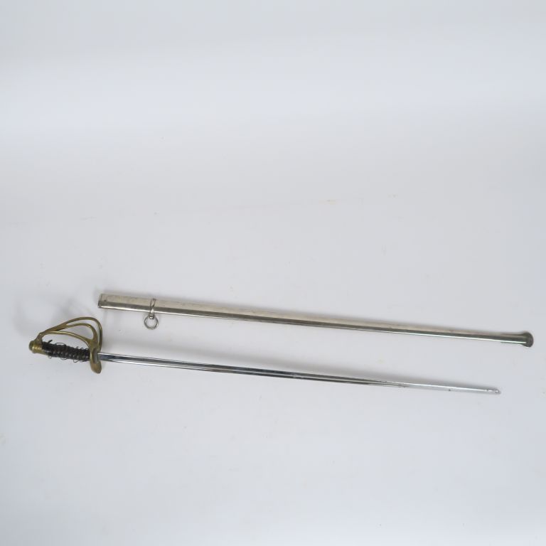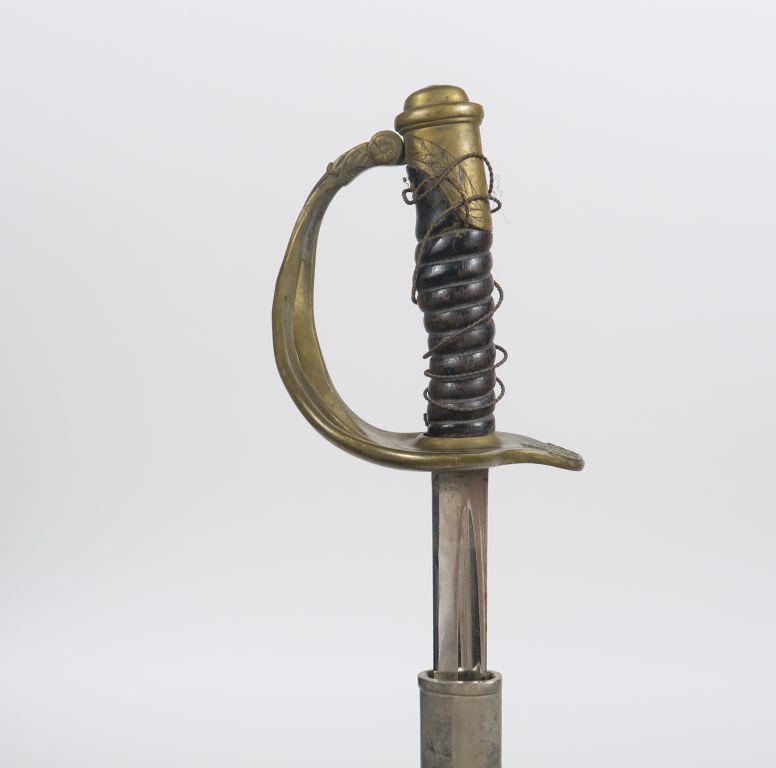 Sabre d’enfant type officier 1822. Poignée en bois verni (reste de filigrane). Monture en laiton, garde à trois branches décorée de feuilles de laurier. Lame droite à pans creux signée de BALP Fourreau en tôle de fer nickelé à un bracelet. Longueur : 83 cm. A.B.E. (Usures)