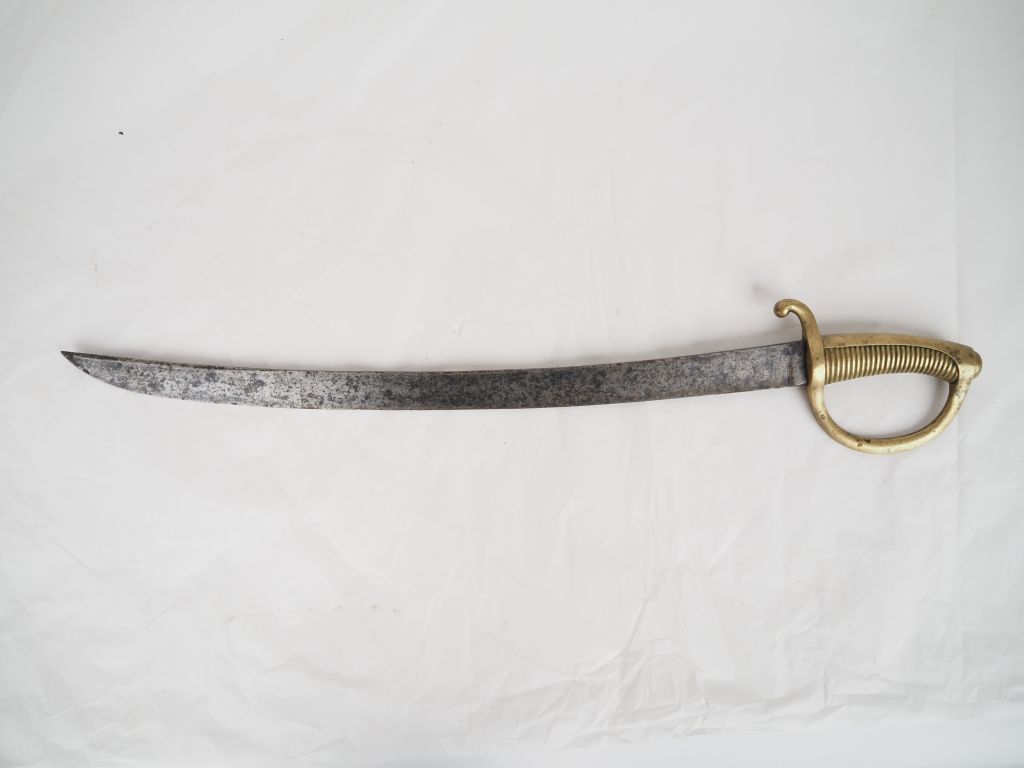 Sabre d’infanterie dit Briquet modèle AN XI Monture en bronze, garde à une branche poinçonnée. Lame courbe à dos plat, poinçonnée au talon. A.B.E. SF, vers 1830. Longueur : 75 cm.