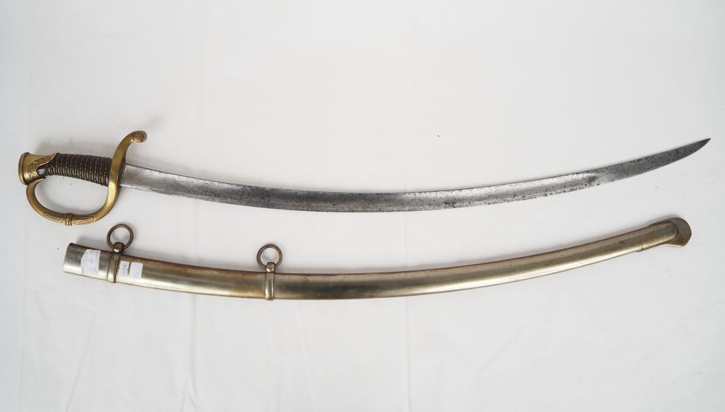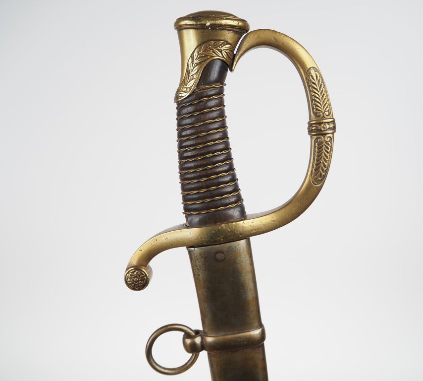Sabre d’officier de canonnier monté modèle 1829. Poignée (remontée) en corne avec filigrane en laiton postérieur. Monture en laiton, garde à une branche, à décor de lauriers et palmettes. Lame courbe à dos plat gravé « Coulaux Ainé Cie Klingenthal » Fourreau en tôle de fer à deux bracelets. Longueur : 98 cm. A.B.E. (verni).