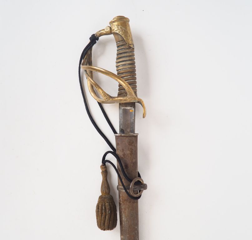 Sabre d’officier de cavalerie, lame droite à gorge et dos plat, monture en bronze doré ciselé de motifs floraux, plateau de garde arqué vers l’avant à redresser, calotte à courte queue, fusée corne filigrane absent. Dans son fourreau à un bracelet arme dotée d’une dragonne à gland doré à bouillon captif d’officier supérieur. Etat 3.