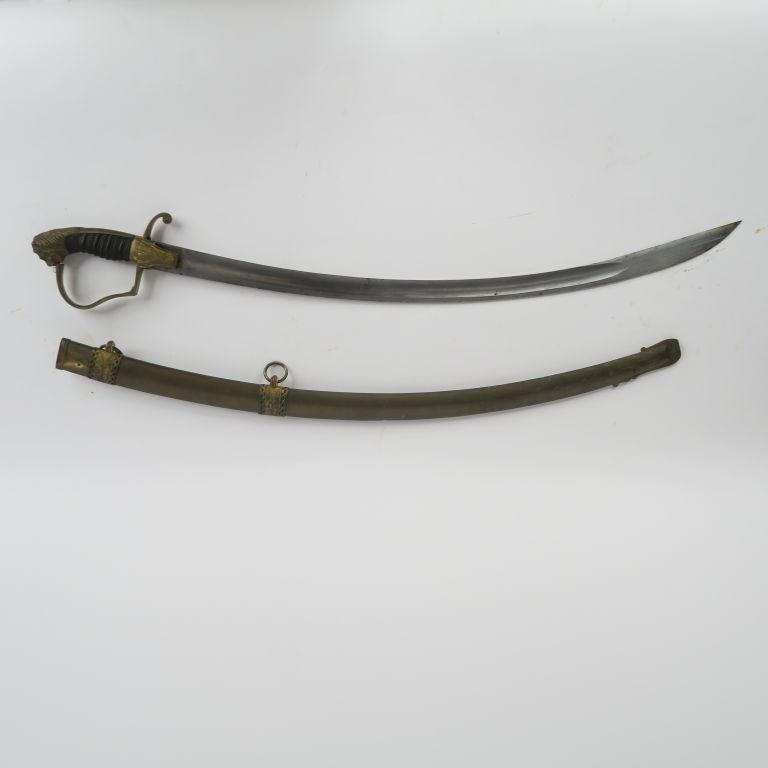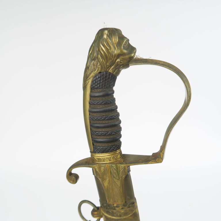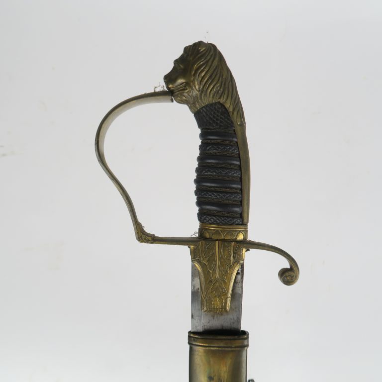 Sabre d’officier de cavalerie légère probablement britannique. Poignée en bois, en partie quadrillée, avec triple filigrane de laiton. Monture en laiton ciselé (traces de dorure). Pommeau à la tête de lion, garde à la Blücher, gravée de feuillages, oreillons découpés décorés en suite, quillon recourbé vers la pointe. Lame courbe à dos plat et pans creux. Fourreau en laiton bronzé à deux bracelets en laiton doré à décor d’entrelacs et feuillages et deux anneaux. Dard asymétrique en laiton. H. : 92 cm. A.B.E. Début du XIXe siècle.