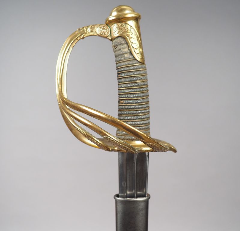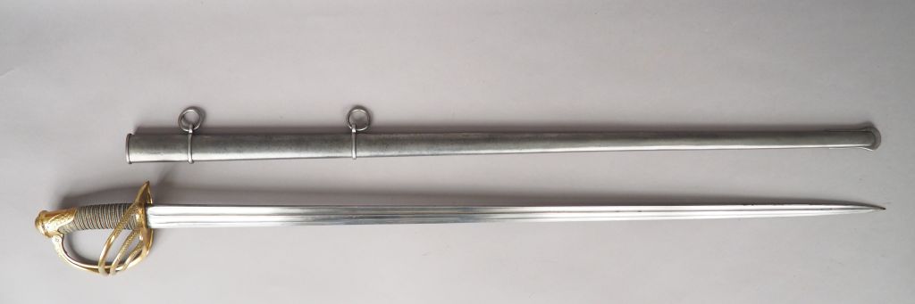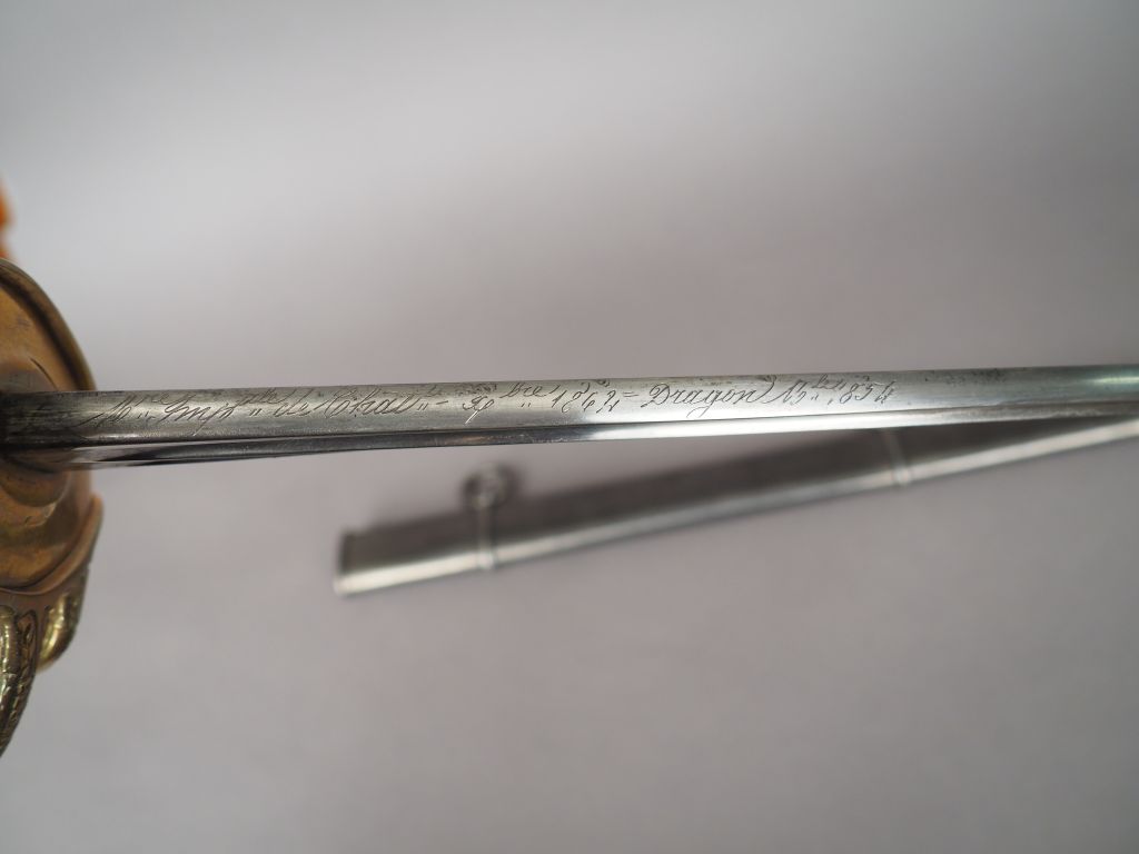 Sabre d’officier de Dragon, modèle 1854. Lame droite à deux gorges et dos plat, marquée au dos « Manufacture impériale de Châtellerault, Septembre 1864, Dragon 1854 ». Monture en bronze doré à décor floral, fusée habillée de galuchat et filigranée. Dans son fourreau en tôle d’acier. Etat 1