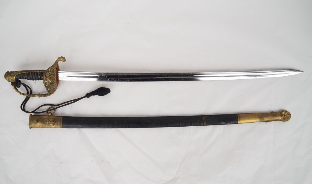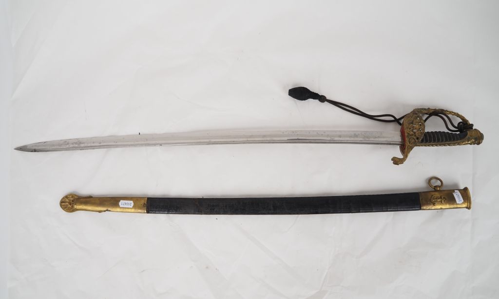 Sabre d’officier de marine. Poignée en corne. Monture en laiton doré, garde à une branche ajourée à l’ancre de marine. Lame cintrée à pans creux, poinçonnée au talon, gravée sur le dos « Coualux Cie Klingenthal » Fourreau en cuir (usures) à deux garnitures en laiton doré. A.B.E. IIIe République. Avec dragonne en passementerie de fil noir.