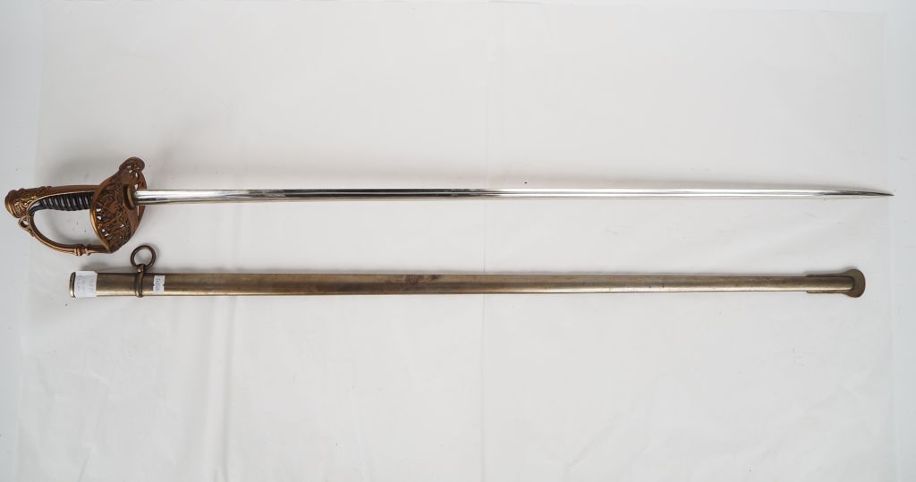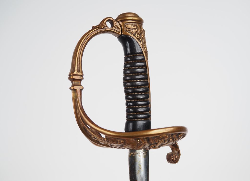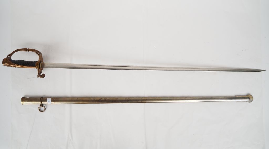 Sabre d’officier d’infanterie coloniale. Poignée en corne avec filigrane. Monture en laiton cuivré, garde à une branche à l’ancre sur faisceau de drapeau. Lame type 1882 signée au talon « Klingenthal ». Fourreau en tôle de fer à un bracelet. A.B.E. Fin du XIXe siècle. Longueur : 105 cm.