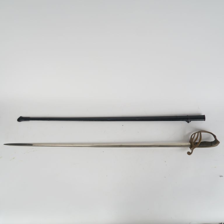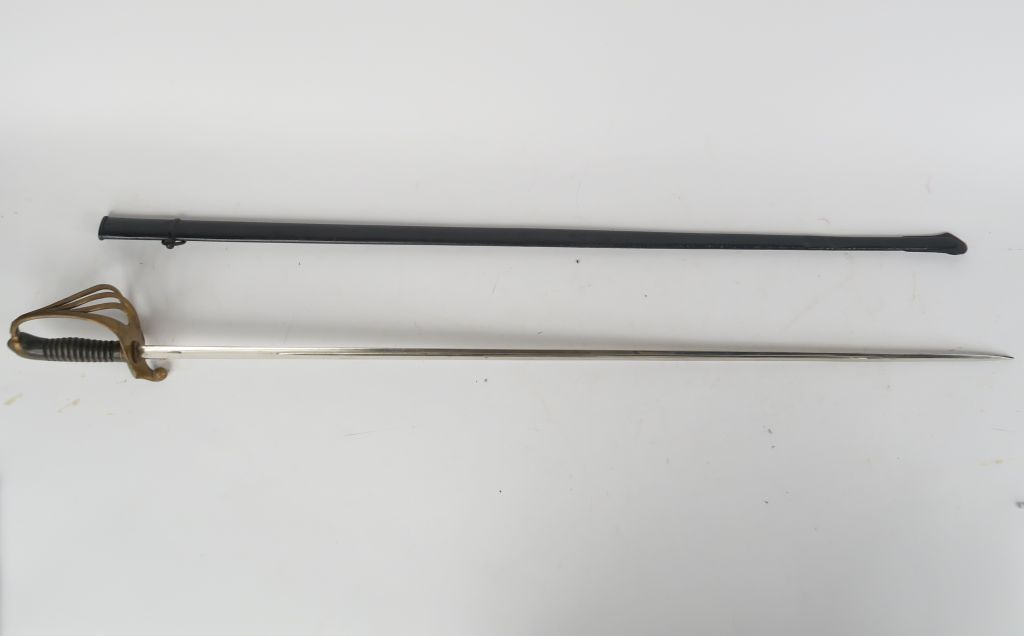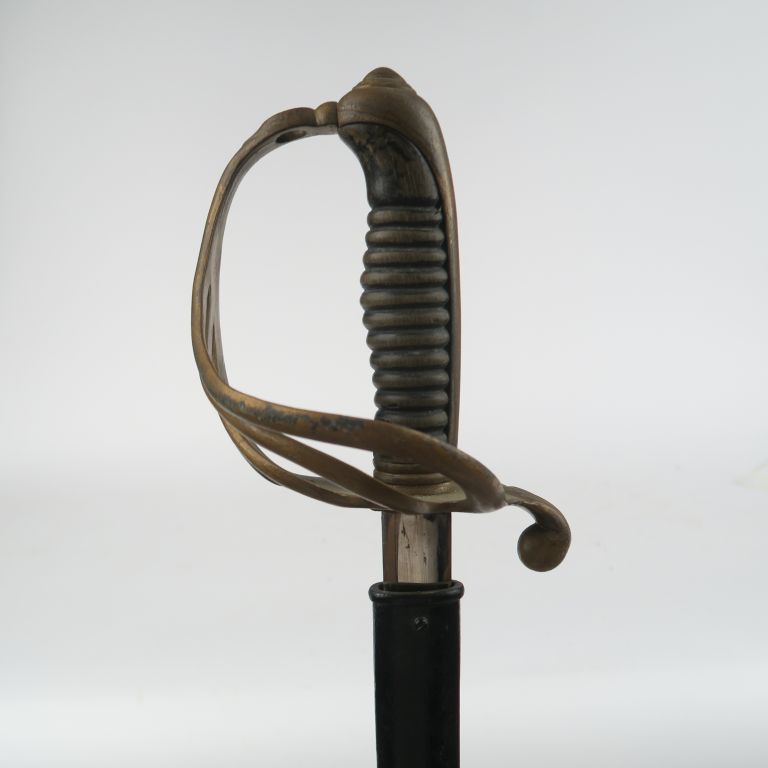 Sabre d’officier d’infanterie modèle 1882. Monture en fer repeint en doré. Poignée en corne (manque le filigrane). Lame droite lenticulaire à gouttière. Fourreau à un bracelet et anneau, repeint en noir. E.M.