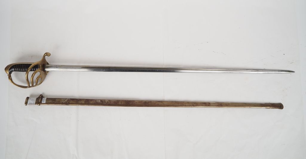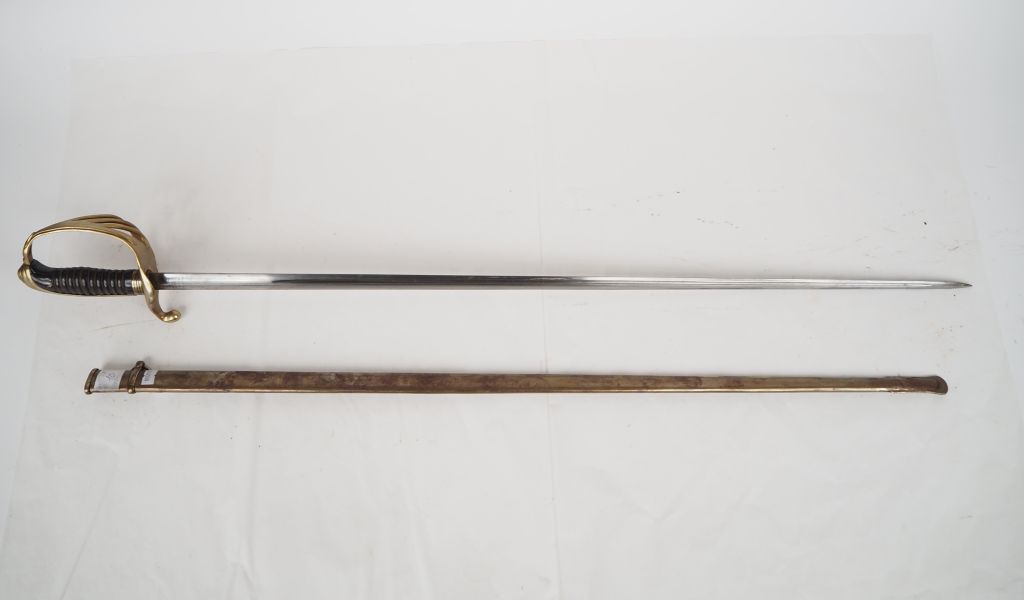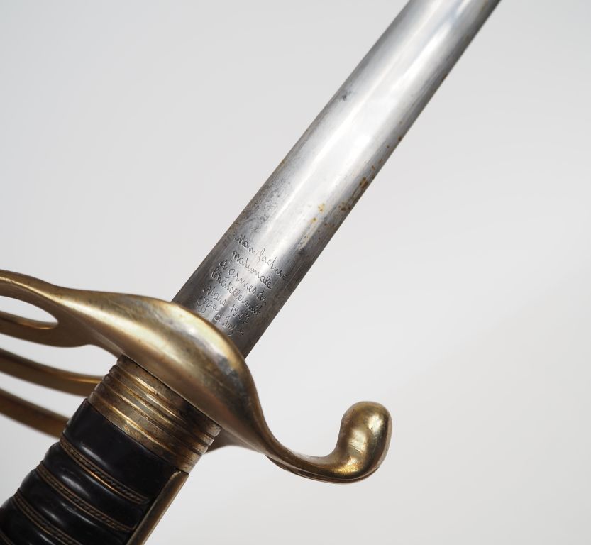 Sabre d’officier d’infanterie modèle 1882. Poignée en corne avec filigrane. Monture nickelée (vernie), garde à quatre branches. Lame lenticulaire à gouttière, gravée au talon de Châtellerault Mars 1927 » Fourreau en tôle de fer à un bracelet. A.B.E. Longueur : 98,5 cm.