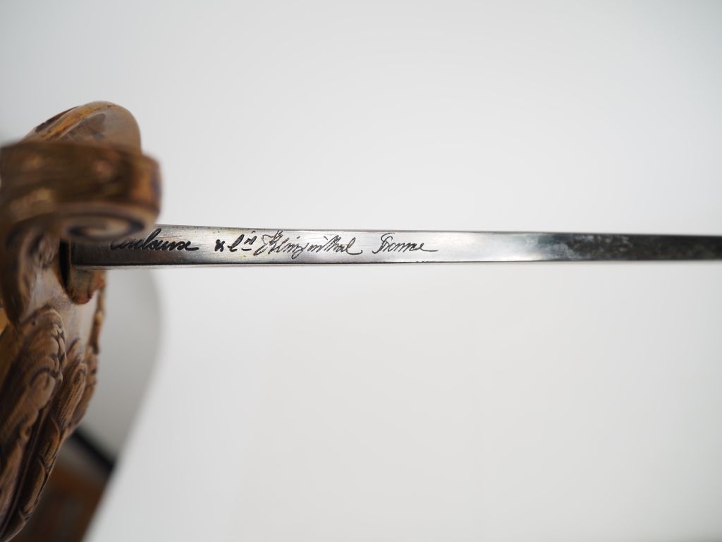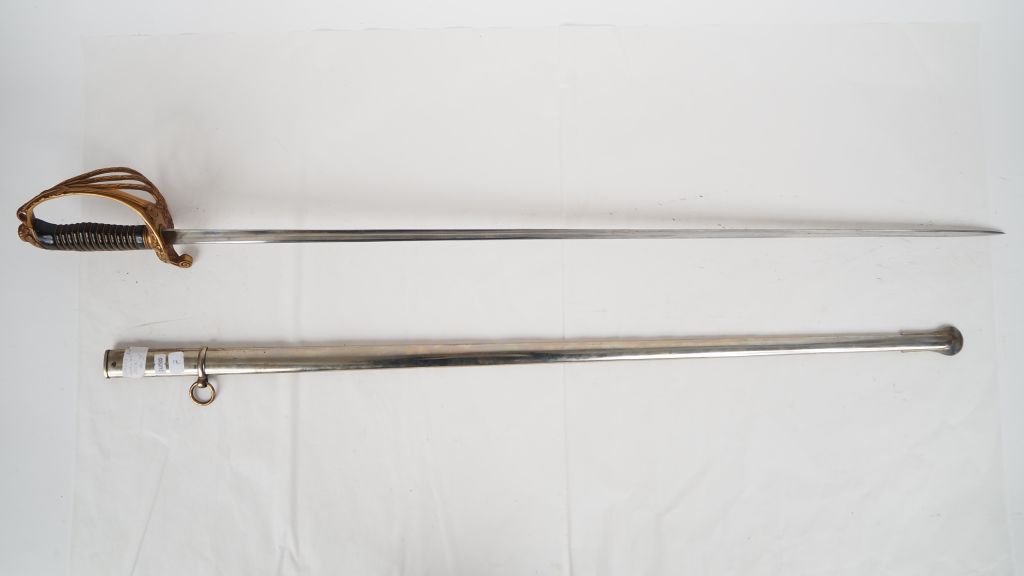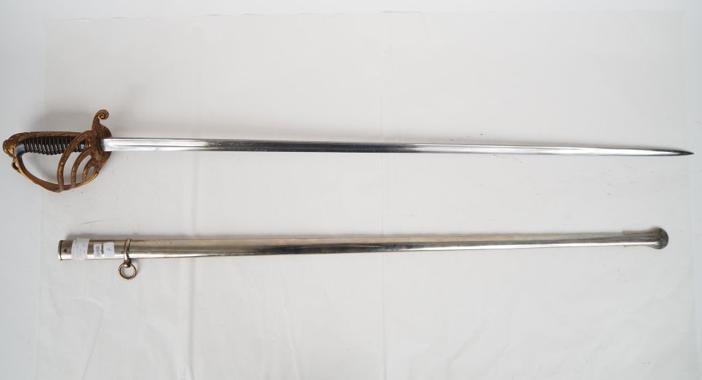 Sabre d’officier d’infanterie, modèle de fantaisie. Poignée en corne laquée, avec filigrane doré. Monture en laiton cuivré, ciselé. Calotte à longue jupe et garde à quatre branches à décor de feuillages et frises de laurier. Lame à dos plat gravé « Coulaux Cie Klingenthal France », et pans creux. Fourreau en tôle de fer nickelé à un bracelet. Longueur : 106 cm. A.B.E. Fin du XIXe siècle.