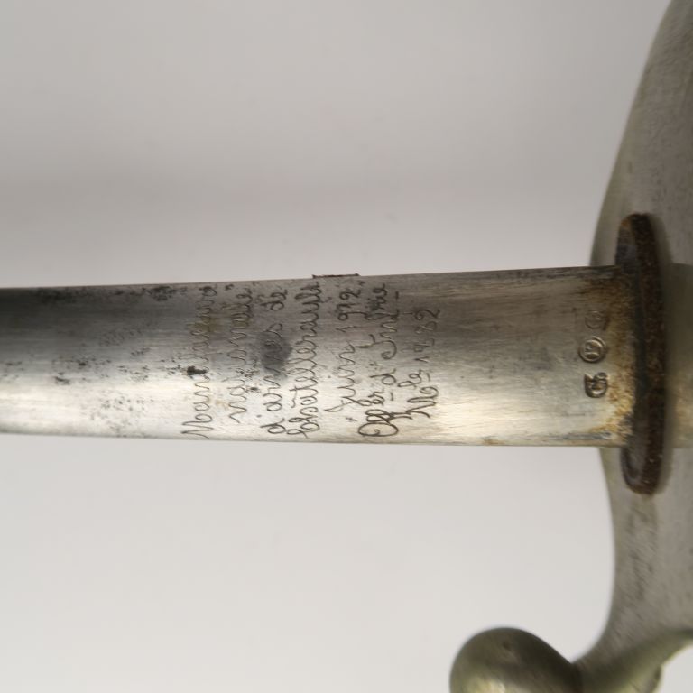 Sabre d’officier modèle 1882. Poignée en corne, avec filigrane. Monture nickelée, garde à quatre branches. Lame lenticulaire de Châtellerault datée Juin 1912 Fourreau en tôle de fer patiné à un bracelet avec gaine en cuir brun de campagne (manque l’extrémité) . A.B.E.