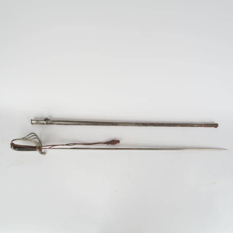 Sabre d’officier modèle 1882. Poignée en corne, avec filigrane. Monture nickelée, garde à quatre branches, poinçonnée SPIQUEL PARIS. Lame lenticulaire à gouttière. Fourreau en tôle de fer (oxydation). Avec dragonne en cuir et suspente en cuir. A.B.E.