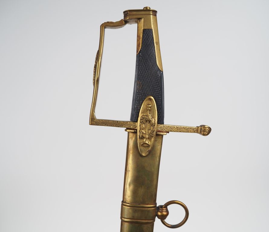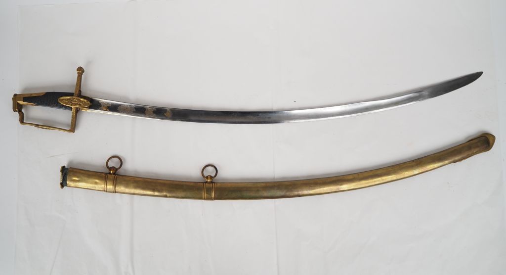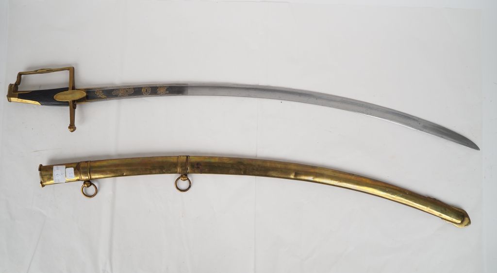 Sabre d’officier supérieur de cavalerie Poignée en ébène quadrillé. Monture en laiton doré, garde à une branche à l’allemande, oreillons ovales à la trompette et couronne de lauriers. Quillon droit. Lame courbe à dos plat, pans creux, gravée, dorée et bleuie au tiers. Fourreau en laiton à deux bracelets. Dard asymétrique. A.B.E. Garde postérieure fabriquée du XXe siècle, au modèle du Ier Empire. Longueur : 94 cm.