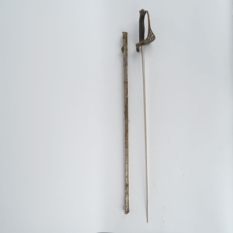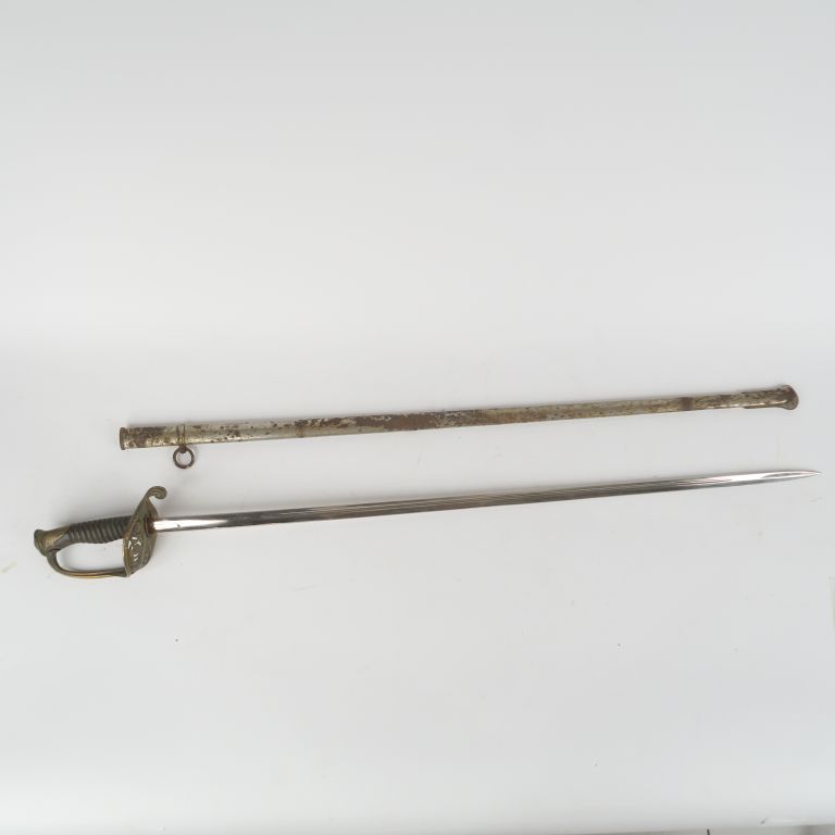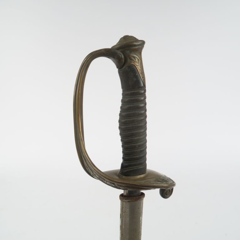 Sabre d’officier supérieur type 1855. Poignée en corne (éclats à la base) avec filigrane. Monture en laiton, pommeau monogrammé « CA »,garde à une branche élargie et ajourée de rinceaux. Lame et fourreau en tôle de fer nickelé à un bracelet type 1882. Longueur : 103 cm. A.B.E. (Oxydations). Fin du XIXe siècle