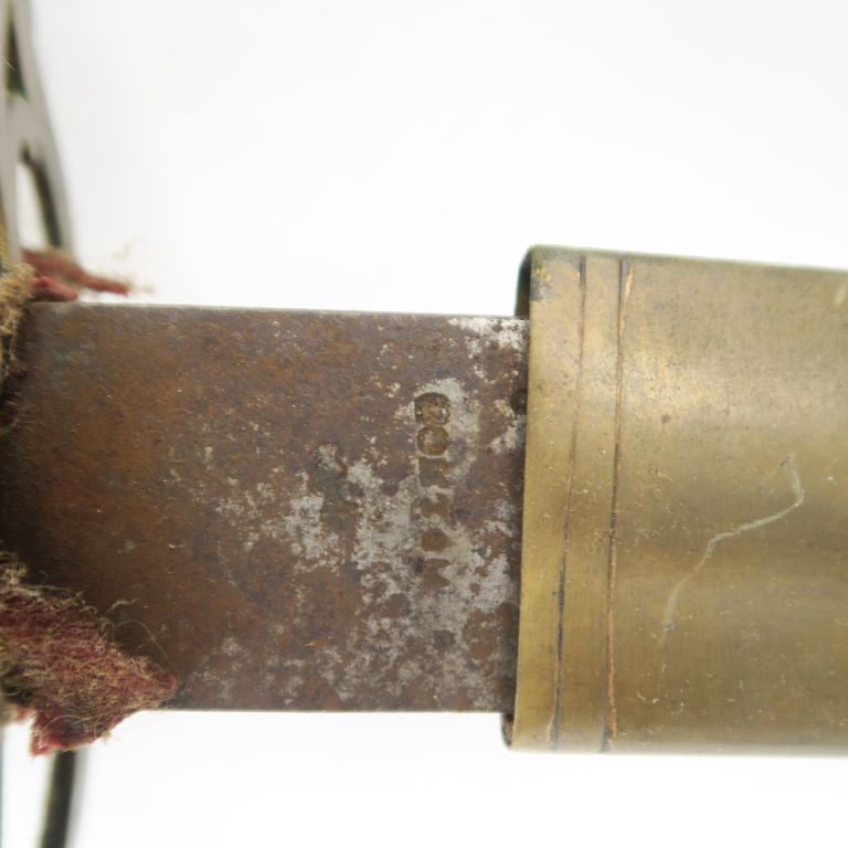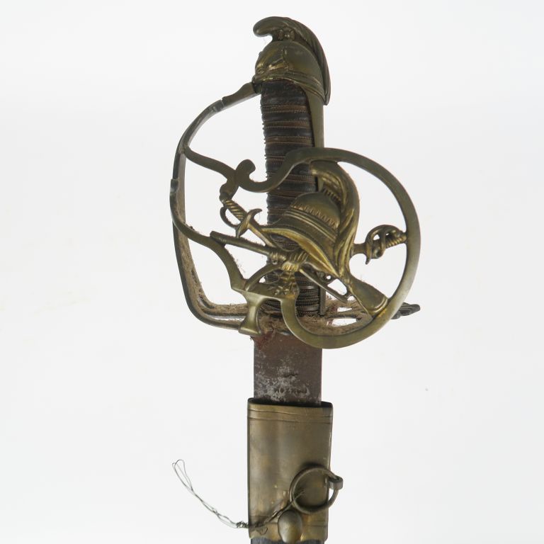 Sabre d’officier volontaire. Poignée recouvert de cuir avec filigrane et lamé de cuivre. Monture en laiton, pommeau au casque empanaché, garde à une branche principale et coquille ajourée au trophée d’arme. Lame courbe (bloquée dans le fourreau). Fourreau en cuir à trois garnitures en laiton, et deux anneaux (bouterole postérieure). A.B.E. (Cassure à une sous branche). Epoque révolutionnaire.