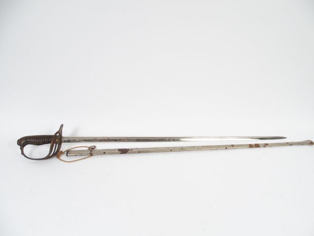 Sabre Français d’officier, fusée corne filigranées, branches de garde multiples en jonc de bronze symétriquement réparties par 3 à gauche et à droite de la branche de garde principale plate. Calotte à longue queue. Lame plate de section lenticulaire à deux gorges décentrées signée « Klingenthal » à la base, fourreau en tôle d’acier nickelé (traces d’oxydations).2