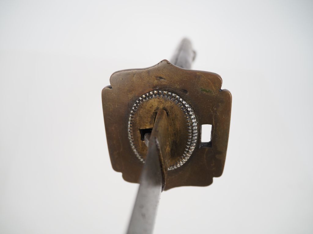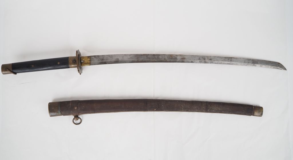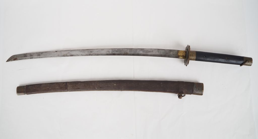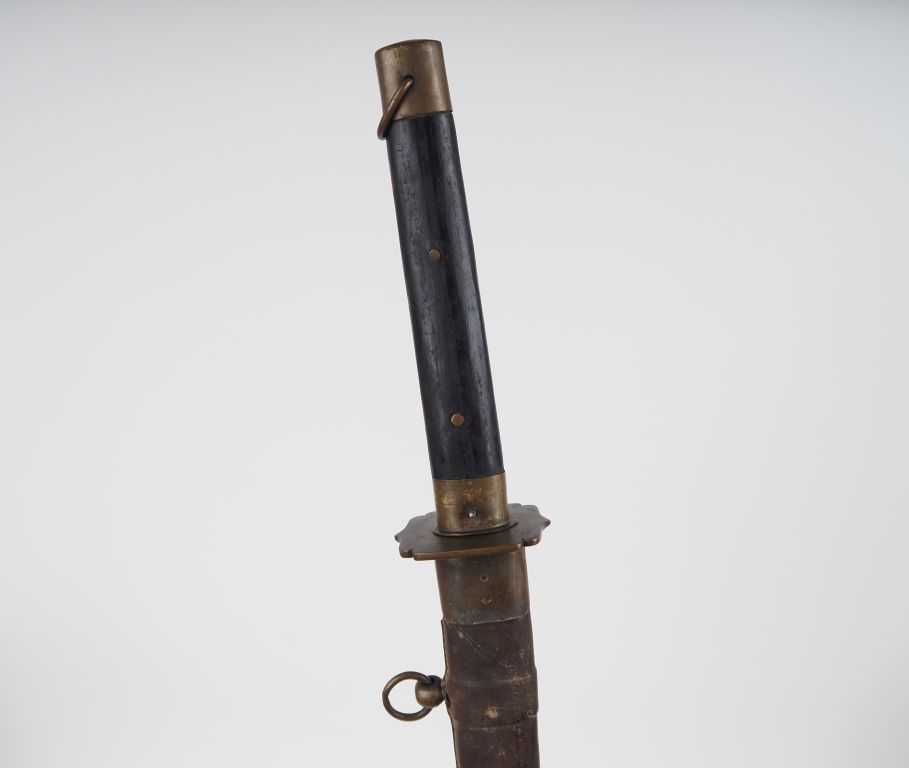 Sabre japonais « Katana » Poignée en bois à deux rivures en laiton. Calotte, virole et tsuba en laiton. Fourreau gainé de cuir à garnitures en laiton. Monté avec une lame ancienne (usures). Longueur lame : 67 cm. Non démonté.