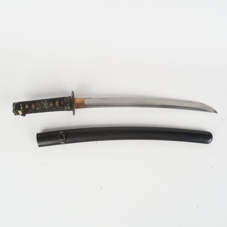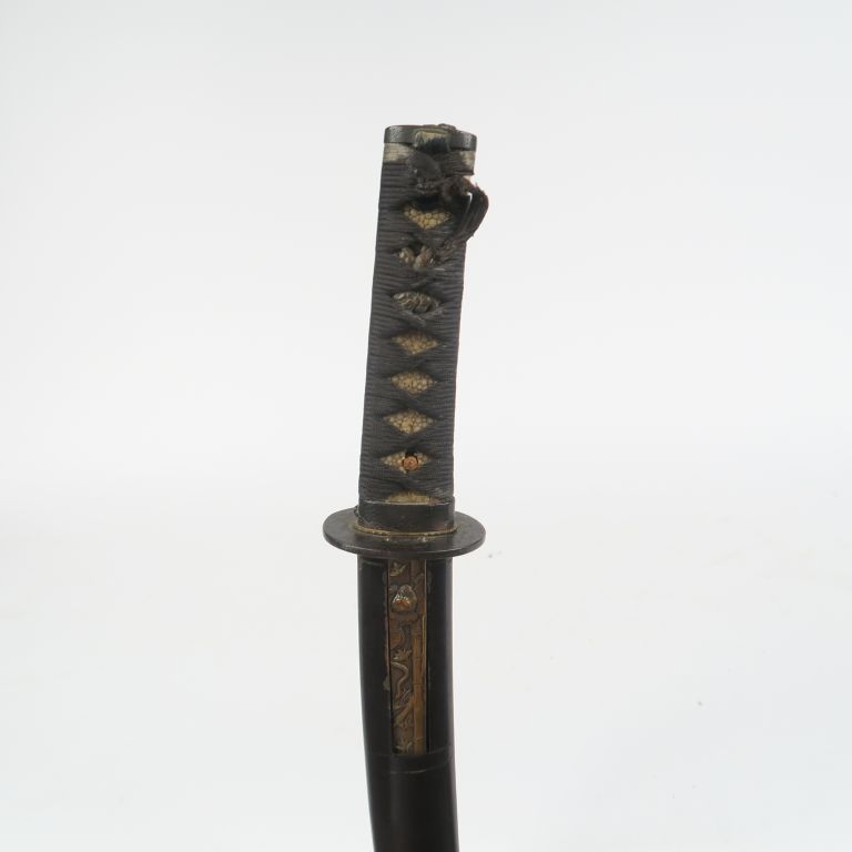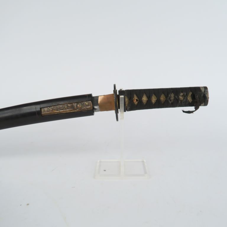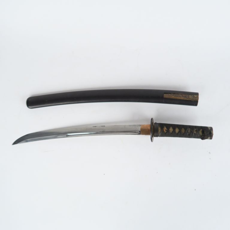 Sabre japonais wakizashi. Poignée recouvert de galuchat avec tressage (petit accident) et menuki. Tsuba plein, patiné noir avec traces de décor à l’argent. Lame à soie signée, à deux fines gouttières sur une face et une plus important sur l’autre, avec belle ligne de trempe. Fourreau laqué noir avec kogatana avec traces de dorure à décor de bambou et tigre. Longueur totale : 53 cm Longueur lame : 37 cm. A.B.E.
