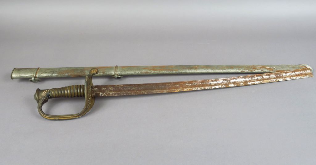 Sabre modèle 1845 d’adjudant, lame brisée, dans son fourreau à 2 garnitures (avant 3éme république).Etat 3.