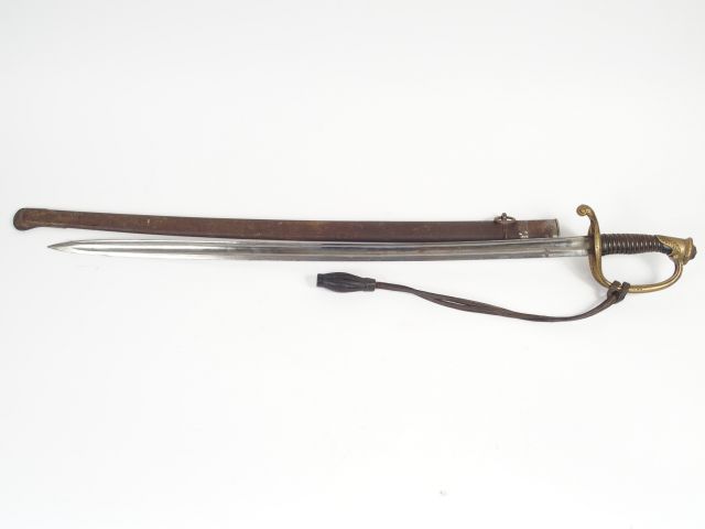 Sabre réglementaire Français d’adjudant d’infanterie modèle 1845, Belle lame courbe à gorge en très bel état marquage au dos ”Manufacture d’armes de Chatêl.Mai 1878. Adjudant Infanterie 1845”.Monture en bronze doré, fusée en corne à filigrane. Fourreau tôle d’acier à un bracelet.1-